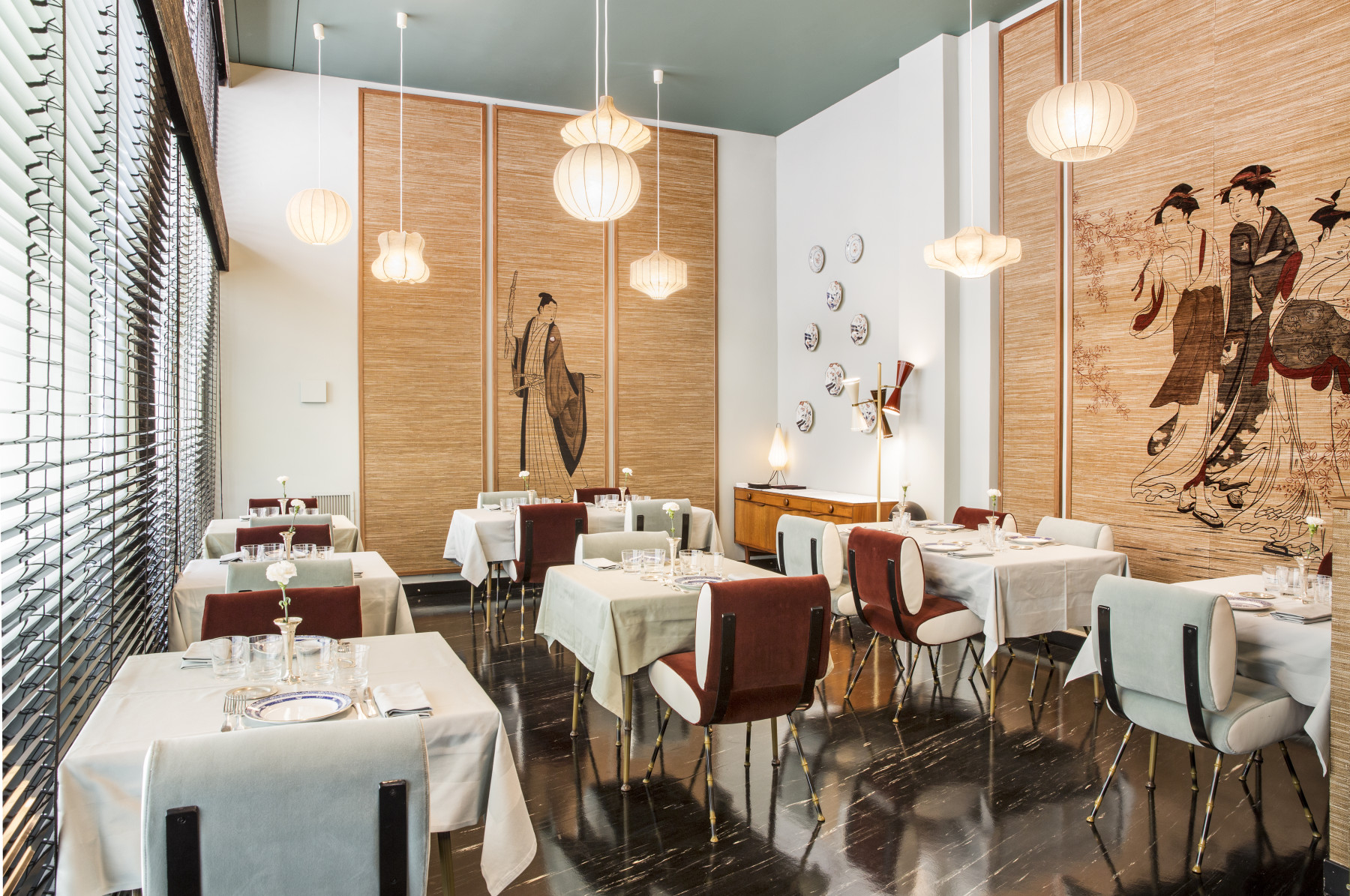 “Ma non solo,” precisa il maȋtre Diego Gioia, “non limitiamo la fantasia della Signora, a cui piace spaziare. Un viaggio in Oriente, ad esempio, ha ispirato l’idea de ‘L’ile de l’Arabesque’, una saletta per eventi privati, collegata al ristorante, con geishe e samurai che osservano gli ospiti dalle pareti e narrano di avventure esotiche.” La Signora, sentito? Anche il linguaggio con cui si evoca Chichi Meroni è d’altri tempi, un po’ vintage come i divanetti, i tavolini, i libri sugli scaffali, la divisione degli spazi e le tonalità di colore.