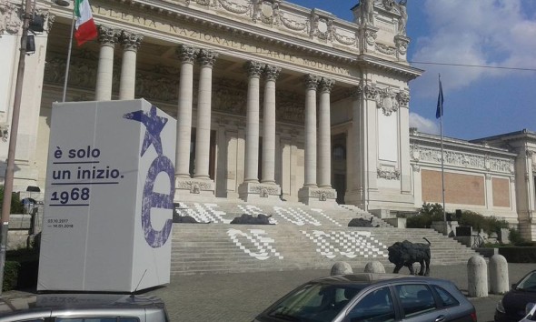 Mancano pochi mesi all’inizio del 50° anniversario del ’68. Nei numerosi dibattiti che ne seguiranno, la probabilità di cadere nella trappola della retorica rasenta la certezza. Aggira sapientemente l’ostacolo e gioca d’anticipo Cristiana Collu -direttrice della Galleria Nazionale d’Arte Moderna e Contemporanea di Roma – che il 2 ottobre ha inaugurato la prima mostra in Italia dedicata al 1968. Il preludio, come ha ripetuto più volte in conferenza stampa. Un’esposizione che non entra nel merito dei contenuti , dei mezzi e dei fini ma invita a guardare ai processi, all’apertura verso un inizio definito “indelebile” . Non a caso il titolo della mostra, a cura di Ester Coen recita : “E’ solo un inizio. 1968” riprendendo lo slogan urlato nelle vie di Parigi e nelle aule della Sorbona.
