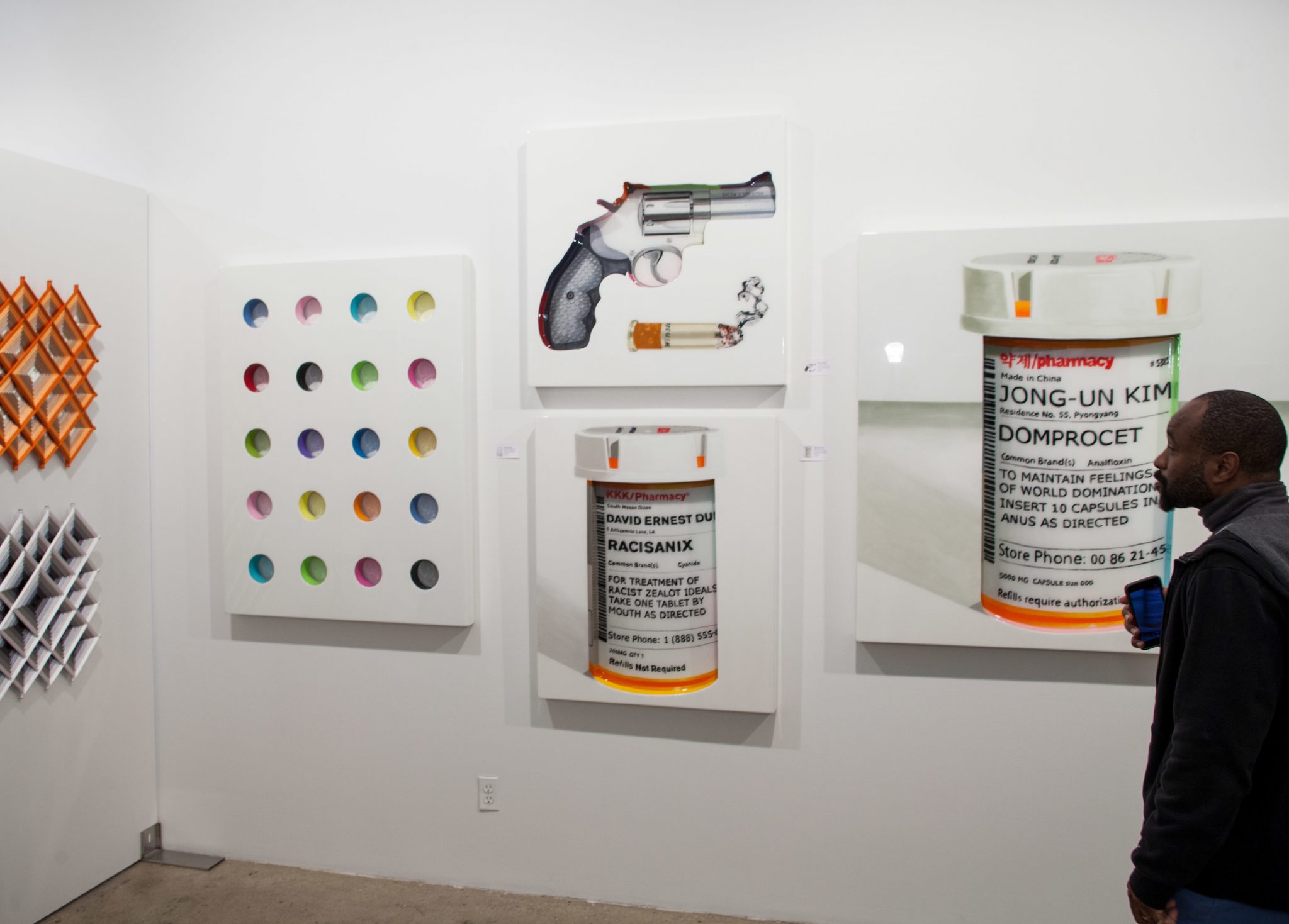 Jeffrey Bisaillon’s humorous acrylic on hardpanel coated in epoxy resin. The 3D panels of Domprocet and Racisanix, depicting pharmaceutical drug jars with hilarious labels commenting on current social plagues including narcissism, xenophobia, racism and gun violence.