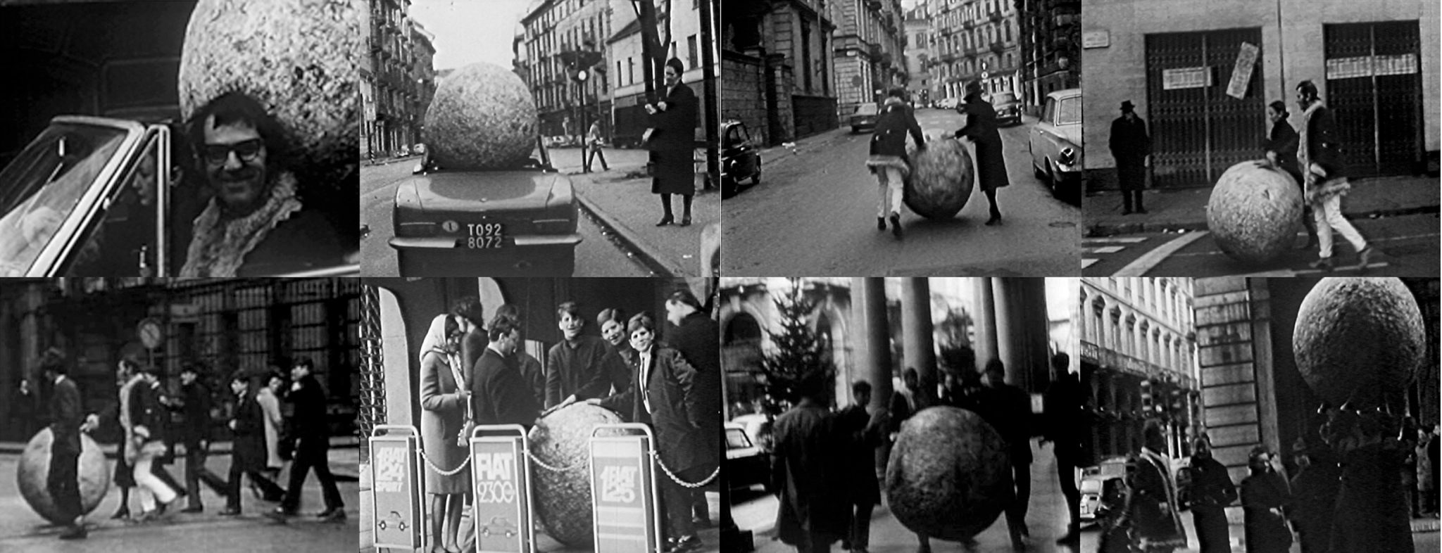 In December 1967, on the occasion of the group show Con-temp-l’azione, as well as in January 1968, Pistoletto walks the Sfera di giornali (Newspapers Sphere) down the streets of Turin together with other artists participating in the exhibition, the gallerist Gian Enzo Sperone, the curator Daniela Palazzoli, Maria Pioppi and passerbys who tagged along