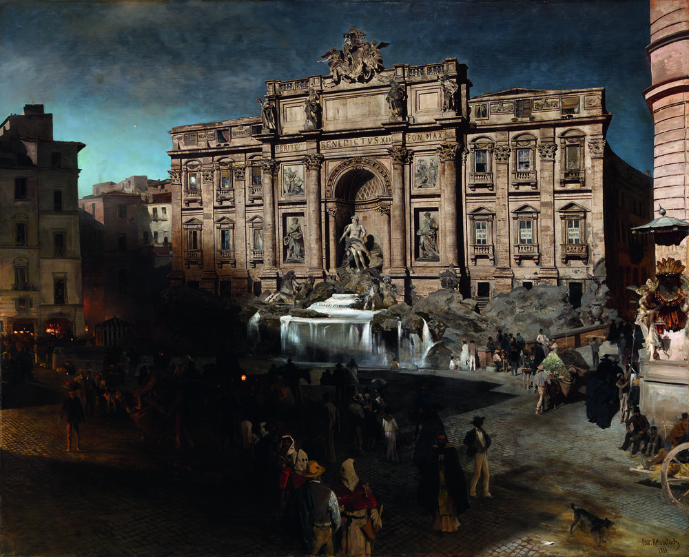 Nel catalogo dell´Ottocento, parecchie le vedute Italiane per mano di artisti stranieri: il cover lot, di Oswald Achnbach, è una insolita veduta notturna della Fontana di Trevi (lotto 2563, €80.000-90.000), accompagnata da scorci di Napoli, Sorrento, Palermo, Tivoli, Bellaggio. Italiana l´unica artista donna in asta, Emma Ciardi (Figurine galanti, lotto 2591, €5.000-7.000).