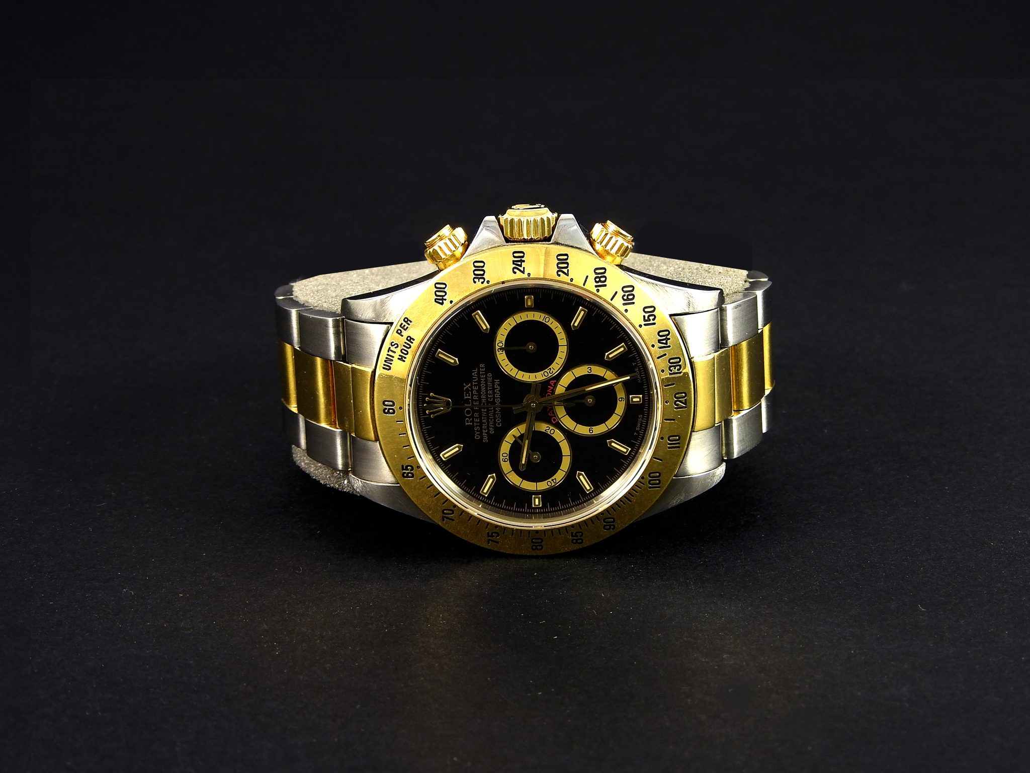 ghiera oro, quadrante a fondo nero con contatori dorati,