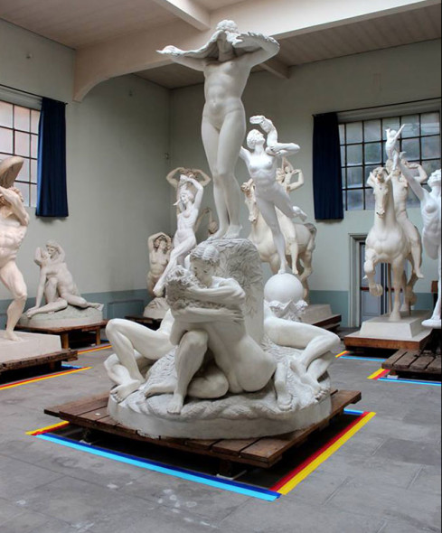 Così, distesa sul pavimento del museo a cingere le sculture, la scomposizione dello spettro cromatico proietta idealmente le opere plastiche in una sorta di viaggio spazio-temporale (un “teletrasporto a basso costo”, lo definisce l’artista) che quasi le porta nel paesaggio contemporaneo dell’area di Fiumicino dipinto da Alioto, quello dove sarebbe dovuto sorgere “The World Communication Centre”.