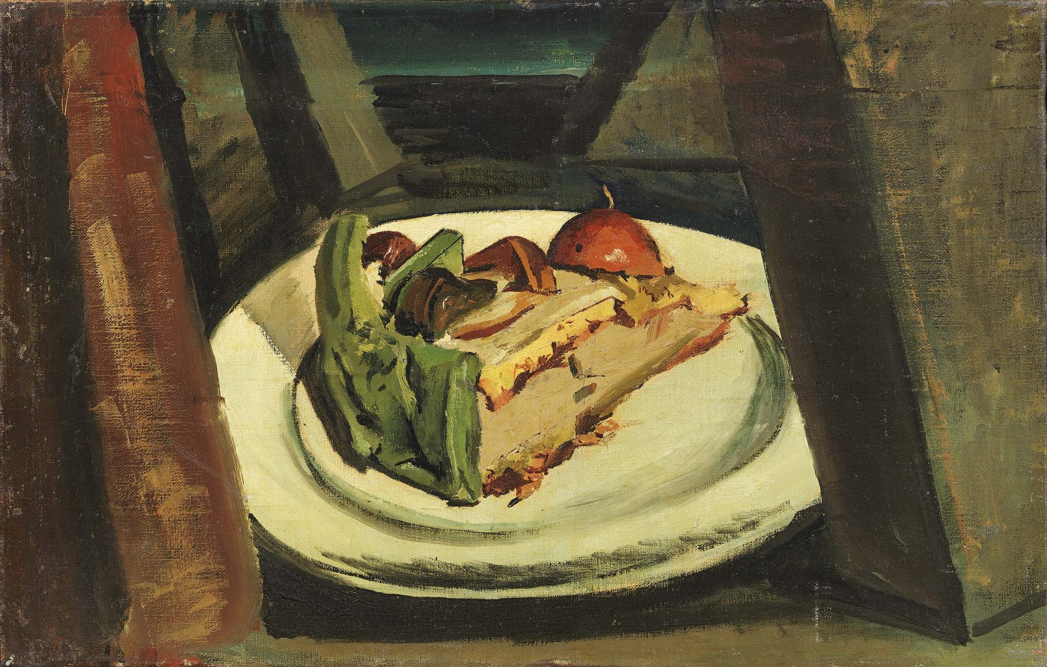 La superficie pittorica ci appare come una tarsia decorativa in cui le forme degli oggetti, estremamente semplificate, si incastrano le une nelle altre, tanto da formare una nuova realtà, compatta e solida. Come scrive Daniela Fonti “la profondità dello spazio e la tridimensionalità degli oggetti, una volta suggerite da cenni chiaroscurali e brevi intersezioni di piani, sono ora accuratamente bandite e, dove occorre, sostituite da ritmi lineari di grande eleganza grafica”.