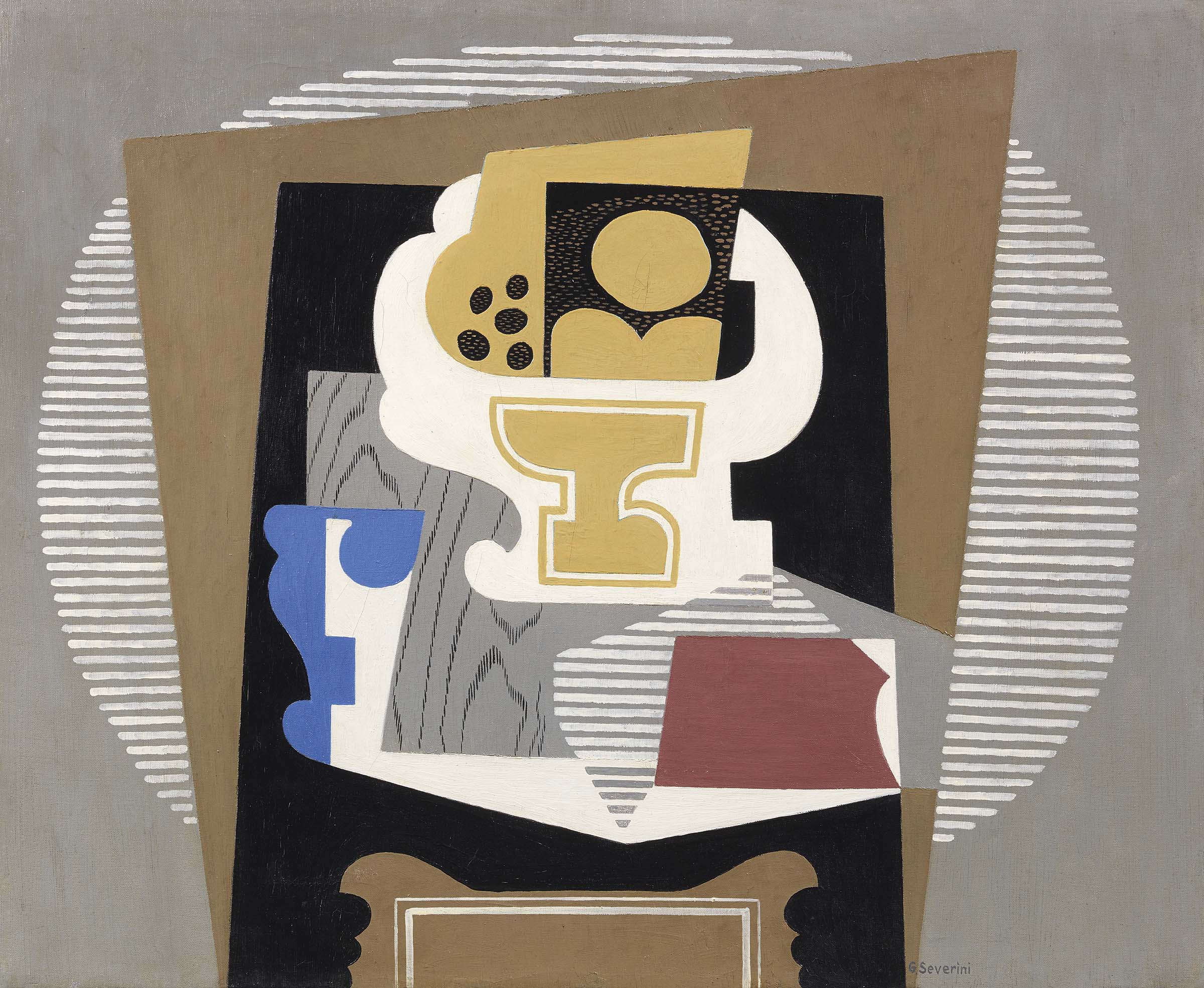 La seconda opera di Severini è “Le consul Ponce de Léon” (1943 circa, olio su tela, cm 72,8×59,5, stima: 60.000/80.000 Euro). Come scrive Cesare Vivaldi, “negli anni Quaranta figure e nature morte, talvolta con sintetici accenni di paesaggi sul fondo, perdono gran parte dei connotati naturalistici insieme alla rigidità ˂metafisica˃ di molti dipinti degli anni Trenta, in favore di una nuova fluidità di linea, di una semplificazione della forma condotta per piani schematici e per segni sinuosi e scattanti…”.