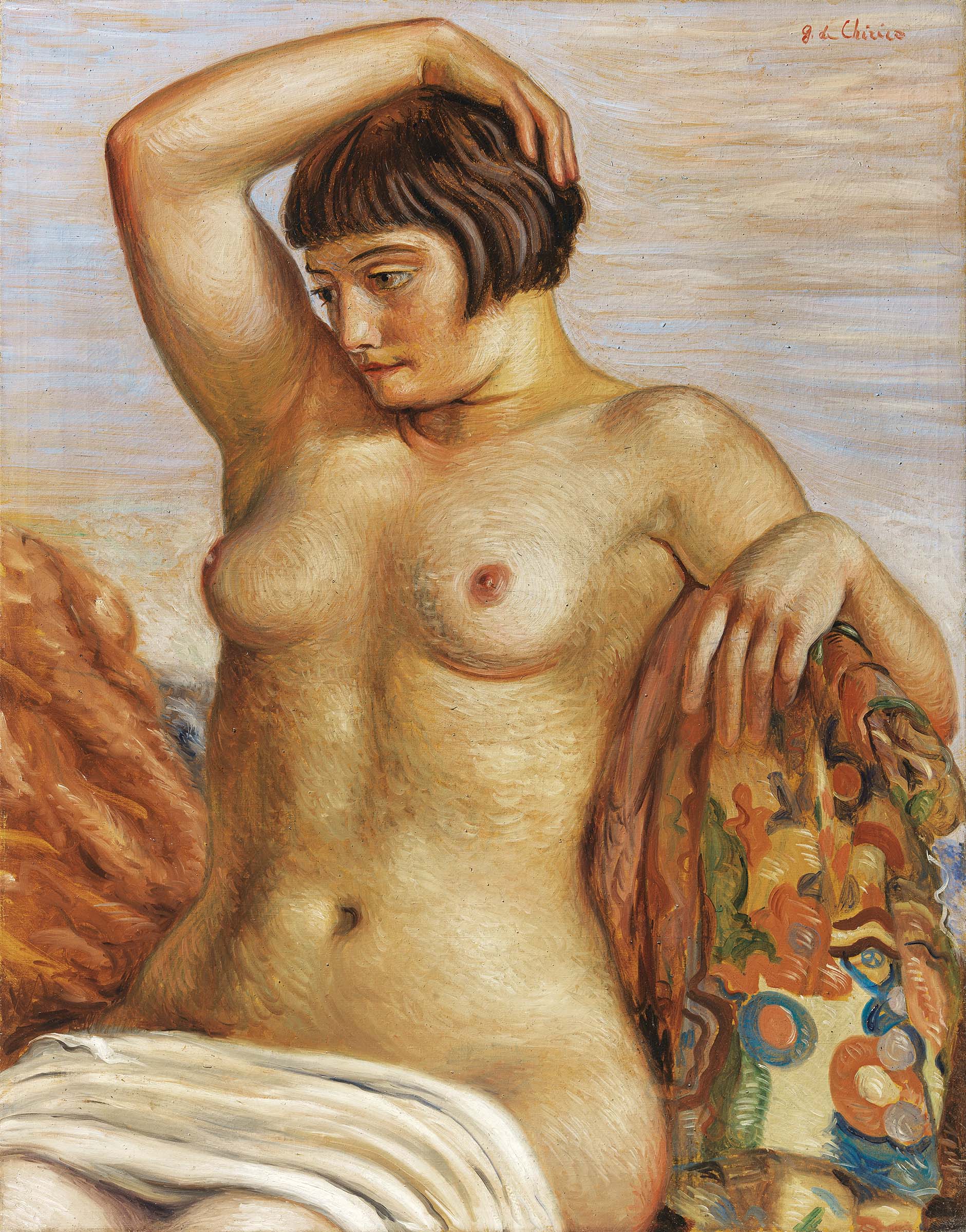 Un’altra opera del “Pictor Optimus” è il “Nudo di donna” del 1932 (olio su tela, cm 90×71, stima: 120.000/180.000 Euro), simbolo del “ritorno all’ordine” dopo le esperienze metafisiche e ottimo esempio dell’abilità dell’artista nel rendere la psicologia del personaggio raffigurato e creare particolari atmosfere meditative e introspettive.