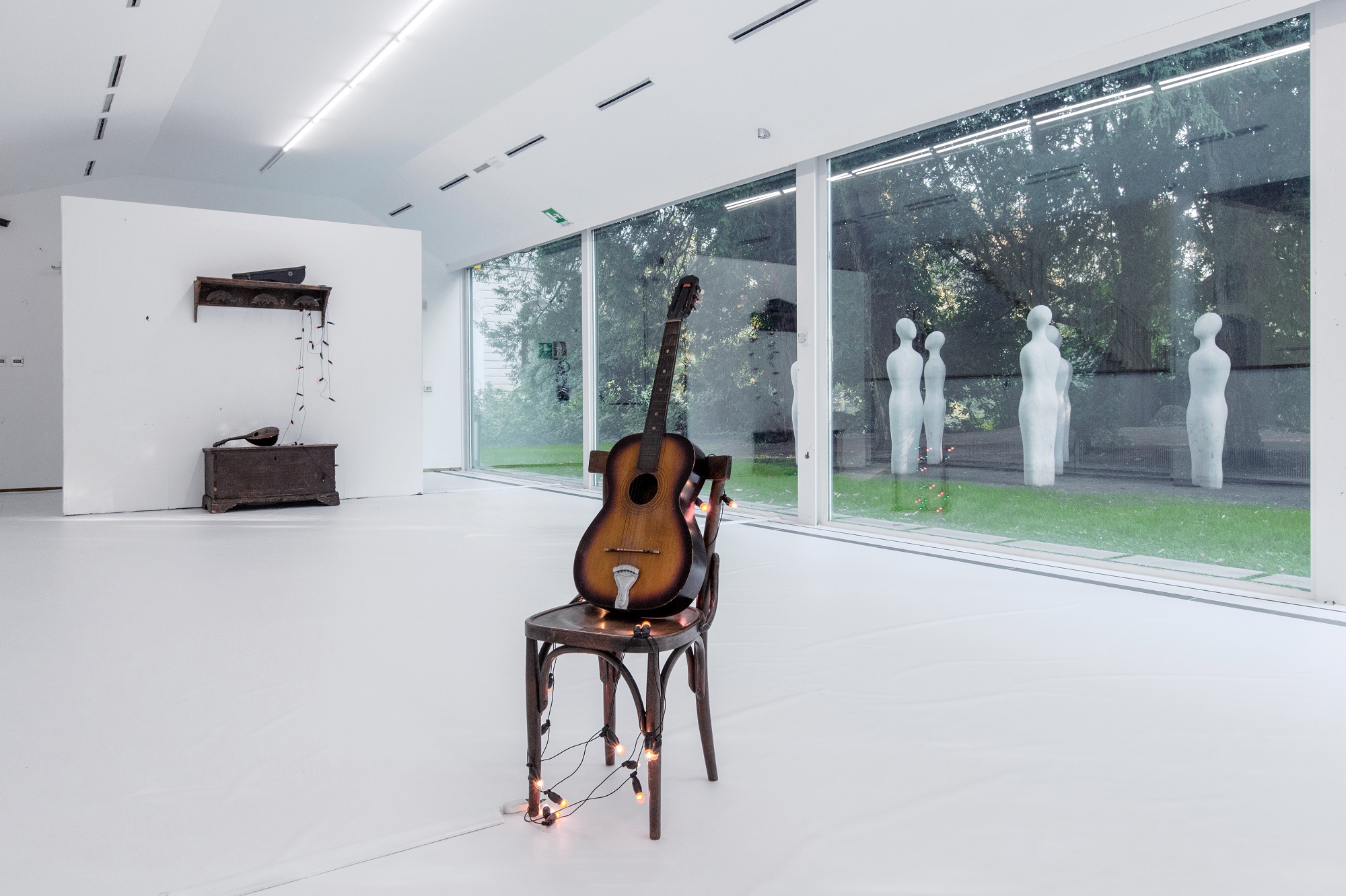 Pensando l’intera mostra come un medium, Vitone trasforma infatti lo spazio fisico dell’istituzione in un opera che funziona come un palinsesto attraverso il quale mostrare i suoi lavori, tra i quali il controverso Souvenir d’Italie (2010) che ricorda i 959 iscritti alla loggia massonica della P2; l’antropologico Nulla da dire solo da essere(2004) in cui su ventuno bandiere appese nel vuoto si trovano citazioni ricamate che provengono dall’ambito del pensiero libertario, attraverso cui Vitone combina l’iconografia del movimento anarchico con quella delle popolazioni Rom e Sinti; l’ideologico Imperium (2014) realizzato da una componente olfattiva e da una componente pittorico-monocromatica; l’autobiografico Ultimo viaggio(2005), che racconta il viaggio da Genova al Golfo Persico percorso da Vitone con la famiglia nell’estate del 1977, e l’opera Corteggiamento (2003-2004) nella sua versione integrale con tutte e nove le sculture musicali dedicate alle muse.