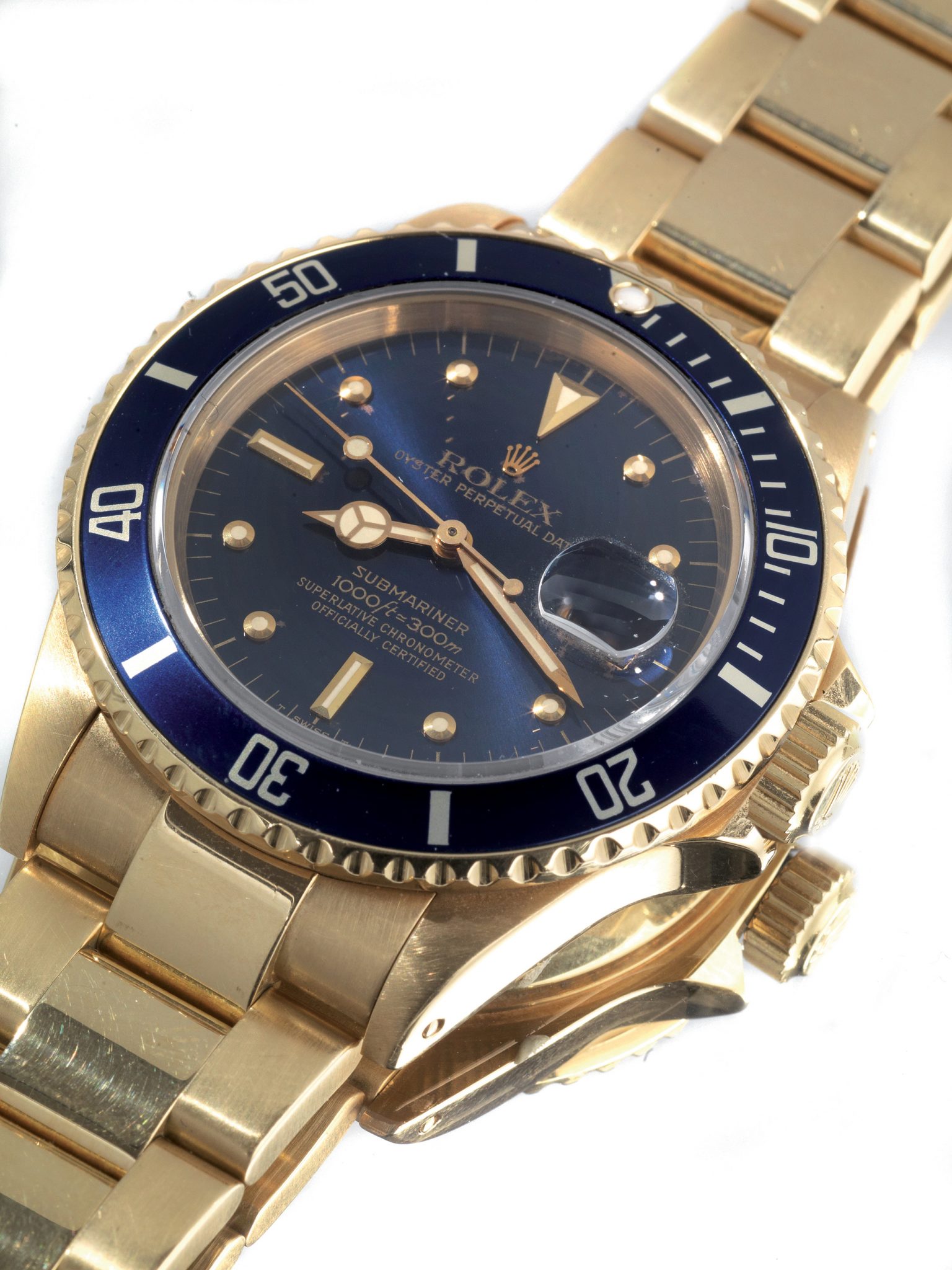 Cassa Oyster in tre corpi in oro 18 Kt con fondello e corona a vite, lunetta girevole blu con indici per tempi immersione e decompressione. Quadrante blu, indici conici, lancette Mercedes, datario a ore 3 con ciclope. Movimento a carica automatica, vetro zaffiro. Bracciale Oyster 18 kt con deployante fliplock. Anno 1986. Scatola in dotazione e una maglia in oro.