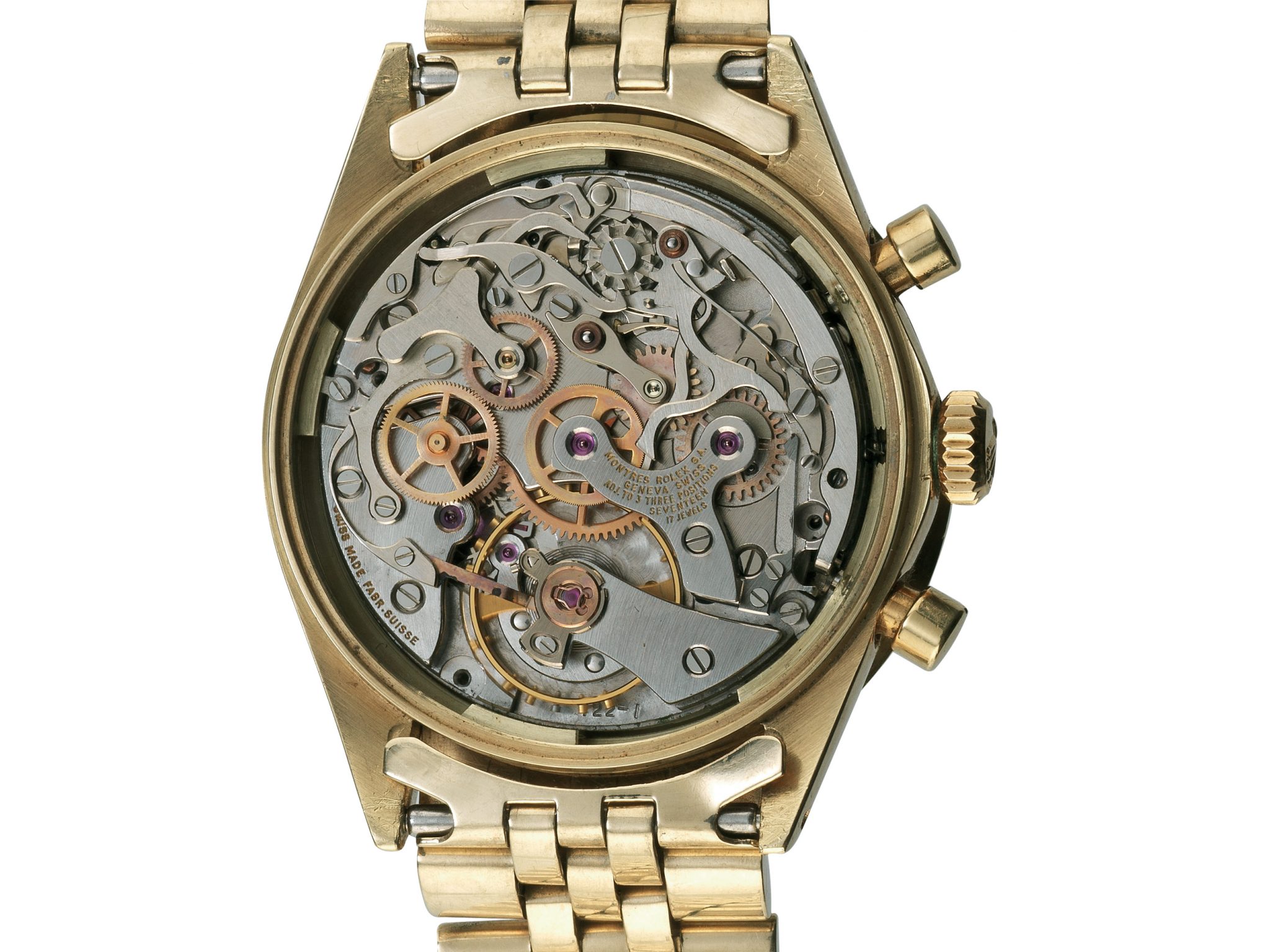 Cassa Oyster in oro 14 Kt, fondello e corona a vite. Quadrante nero con tre contatori di colore oro, così come la lunetta circolare interna. La lunetta, di nuova concezione e di dimensioni leggermente più grandi, è realizzata in due parti: un inserto acrilico nero con scala tachimetrica in bianco è inserito nella ghiera in oro. Lancette a bastone con inserto luminescente, la lancetta della cronografia riporta una piccola freccia di colore nero. Pulsanti a pompa. Il modello monta un bracciale Jubilè 14 Kt USA. Il movimento a carica manuale calibro 722.1.