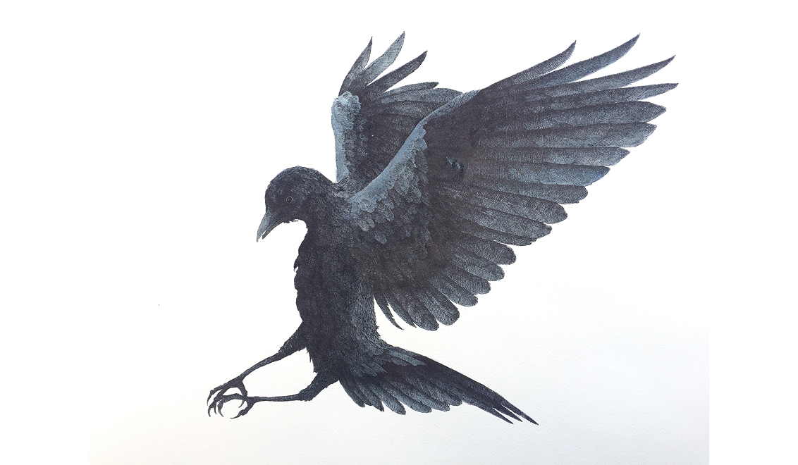 In mostra, nella navata, grandi carte (70×100 cm) a china e acquerello per un’unica iconografia: il corvo, anche soggetto di un’installazione realizzata ad hoc per la grande vetrata absidale.