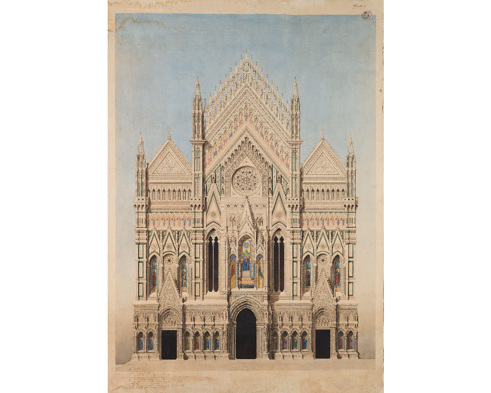 Bozzetto per la facciata di Santa Maria del Fiore a Firenze tecnica mista su carta intelata (cm 151.5×105.5) Iscritto in basso: “Disegno presentato insieme alle sezioni ed altre piante al…nell’anno 1862 per la facciata della St.Maria del Fiore di firenze. Giudizio dato dalla Commissione che trovagli a pag.31 del rapporto stampato in Firenze…nell’anno 1863. E il n°4 che nella parte inferiore, nel tabernacolo della parte centrale e in alcuni luoghi all’atto è bellissimo, ha un modo misto fra …. e l’architettura siciliana medioevale. Ma tali disegni rivelano nel loro…tanta ricchezza di cognizioni artistiche, benchè non appropriate al soggetto, e tanta sicurezza di mano, da meritare di essere, per tali pregi, distinti tra i più dei concorrenti. In alto a destra timbro datato 10.02.’74 (difetti)