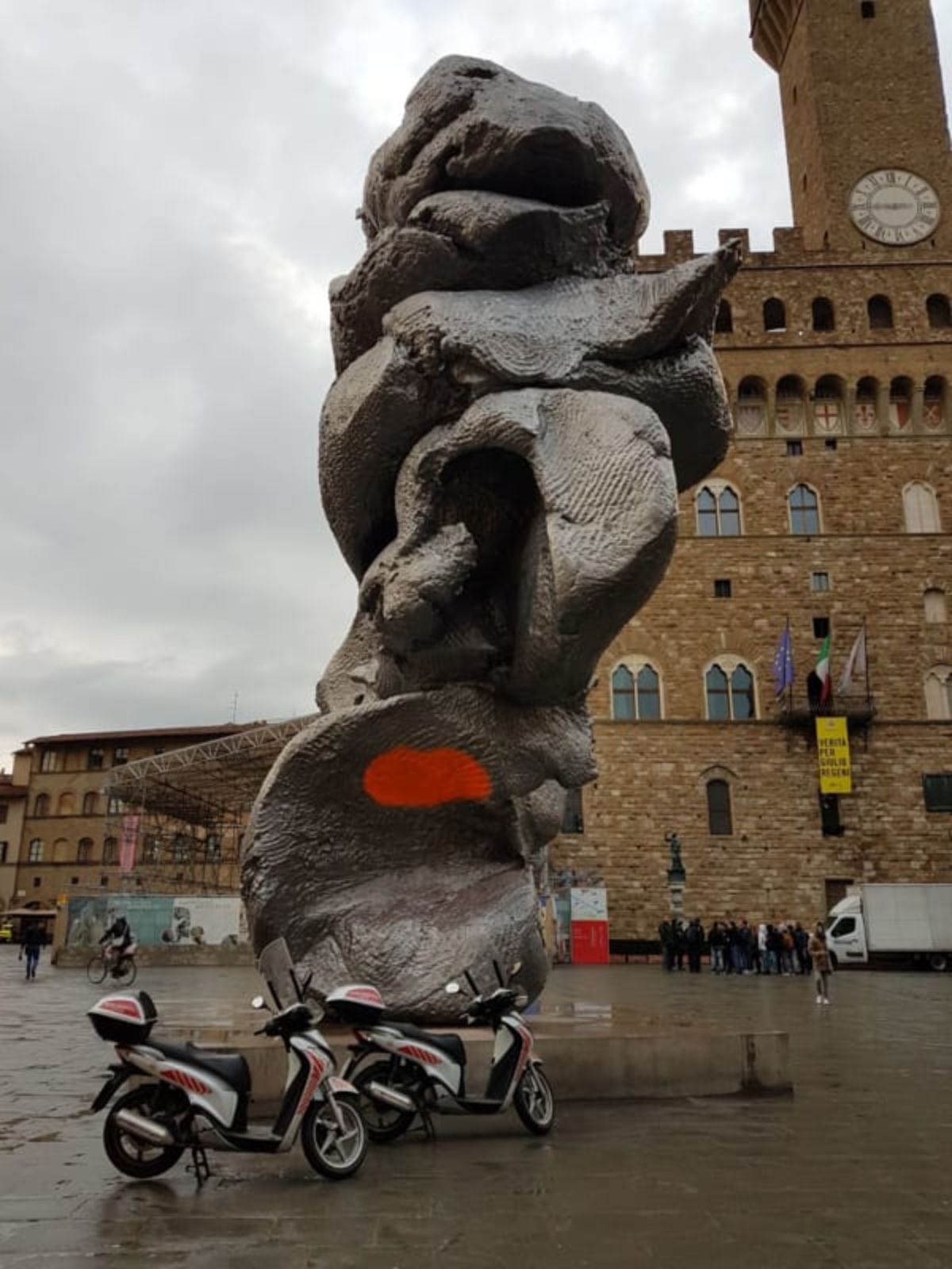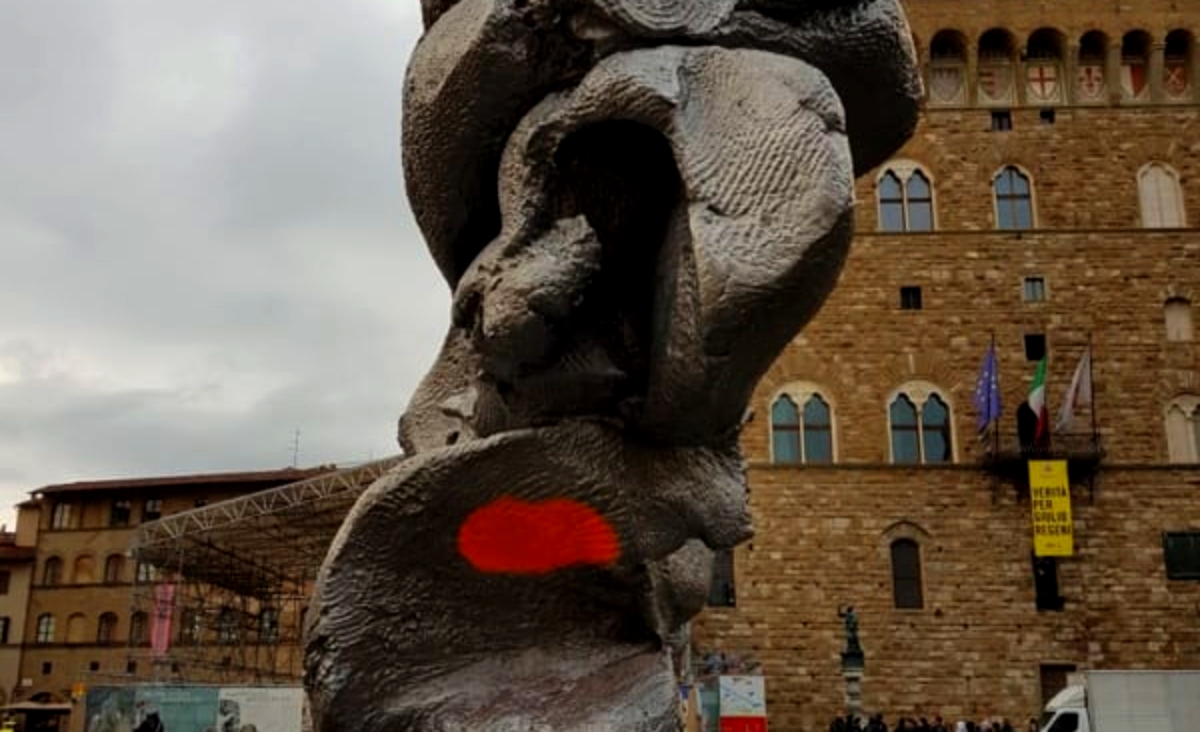 Un uomo è stato bloccato dalla polizia dopo che aveva imbrattato l’opera con una bomboletta spray di vernice arancione. Si tratta di un cittadino ceco da tempo residente a Firenze