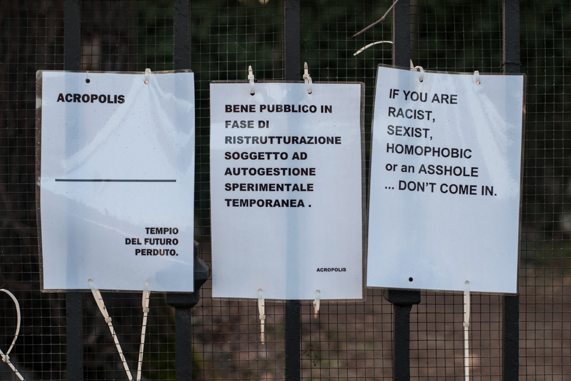 Almeno fino a quando le varie associazioni raccolte in Acropolis – Tempio del futuro perduto hanno deciso di agire autonomamente, prendendo così a cura l’edificio e rendendolo un “bene pubblico in fase di ristrutturazione, soggetto ad autogestione sperimentale temporanea” proprio come c’è scritto sul cartello che accoglie i visitatori fuori dal cancello d’ingresso.