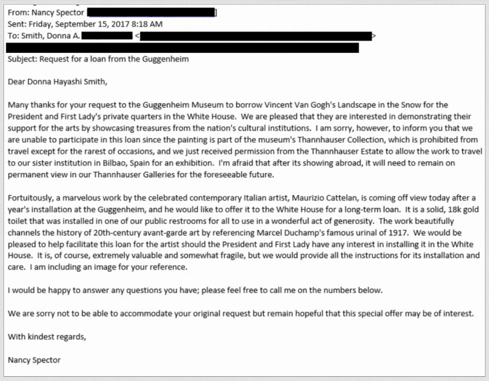 La curatrice capo Nancy Spector risponde però a stretto giro di email scusandosi per non poter esaudire la richiesta (il quadro di van Gogh era già destinato a Bilbao), ma di avere pronta un’offerta alternativa: “America”, la celeberrima toilette d’oro realizzata per il museo dall’artista italiano Maurizio Cattelan, “un’appuntita satira mirata all’eccesso di ricchezza in questo paese“.