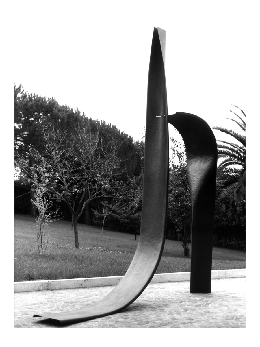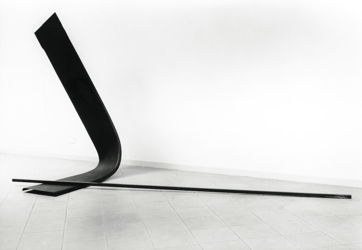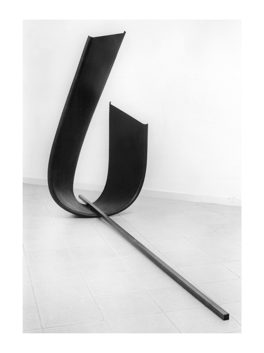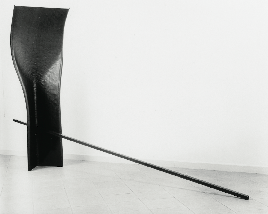 Carlo Lorenzetti Instabile, 1991, ferro sbalzato, grafitato e barra, cm 192 x 125 x 350(2 elementi)