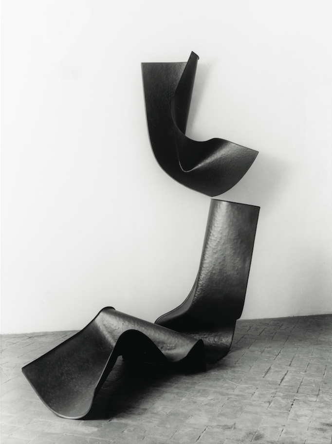 Sidereoerrante, 1989, ferro sbalzato e grafitato, cm 300 x 48 x 235 (2 elementi)