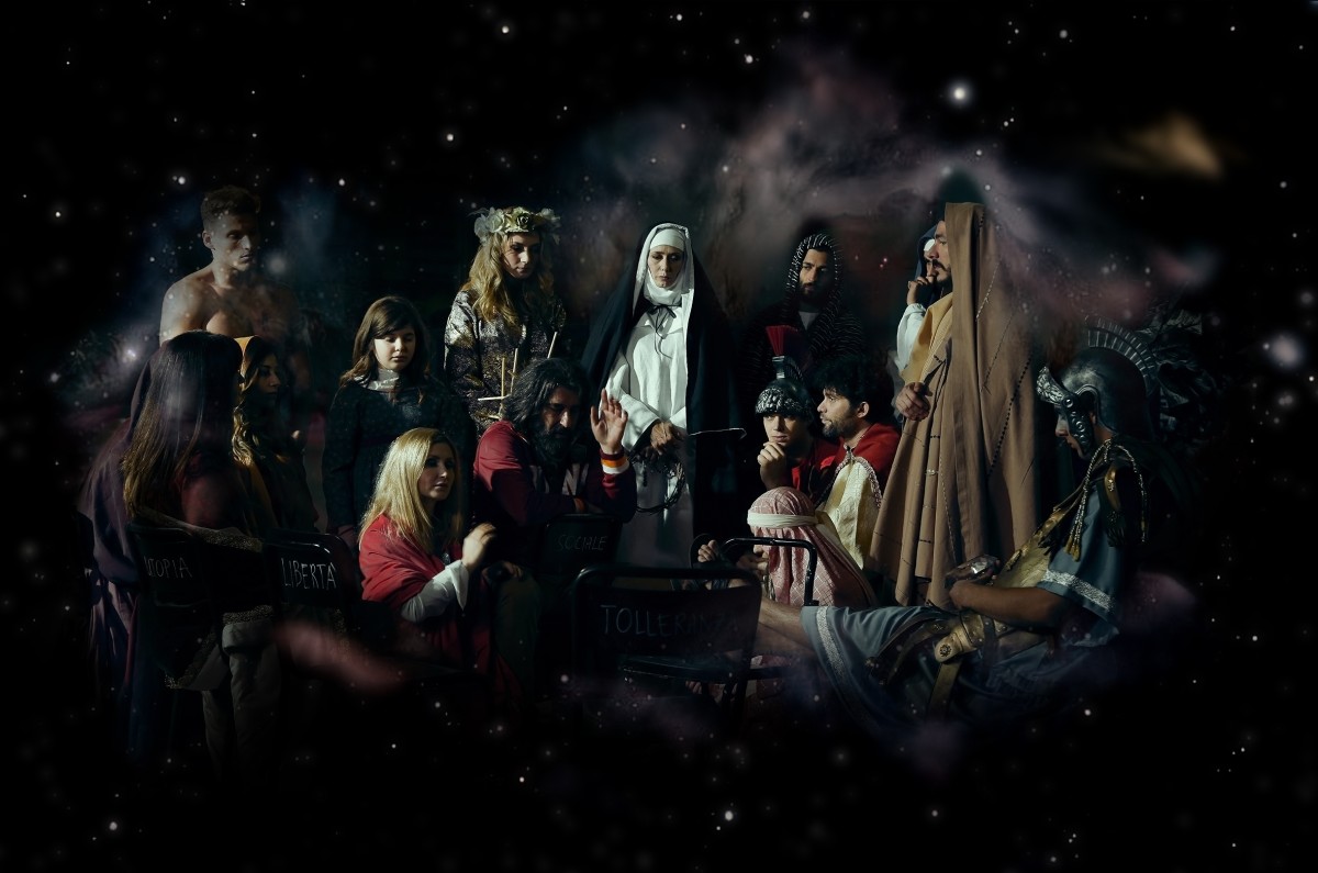 E verranno le performances del ciclo “Rebellio Patroni”, il racconto delle imperfezioni, dei vizi umani dove c’è morale cristiana e insurrezione, questa volta con l’arma della ironia, e il coinvolgimento del pubblico quando, a Milano, la performance con Luca Mangoni che interpreta Sant’Ambrogio inaugura la personale di Palazzo Reale. E quando alla Biennale di Venezia i patroni d’Italia San Francesco e Santa Caterina, interpretati da Elio delle Storie Tese – una sorta di Alberto Sordi in Vacanze intelligenti – e Veronica Barelli, usciranno simbolicamente da un quadro per andare in mezzo alla folla distribuendo santini con la loro effigie e un pensiero come invito all’unione, ad allontanare la discordia.