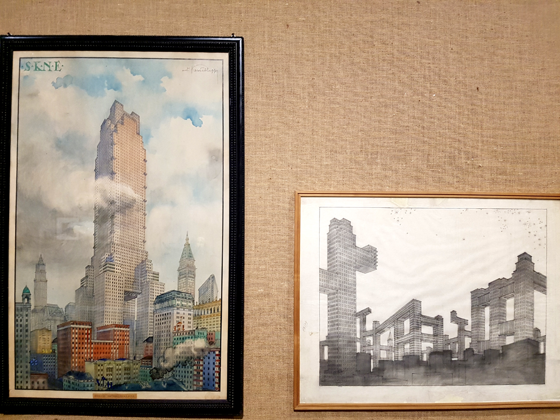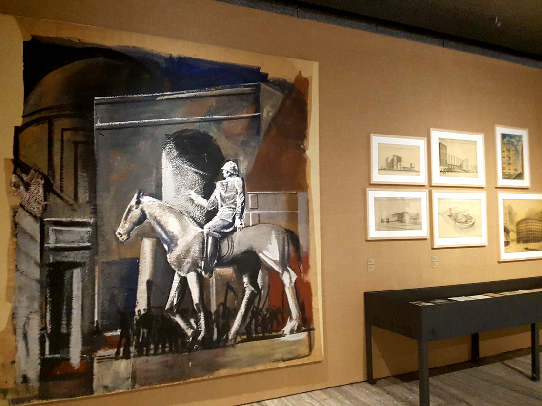 L’attenzione al contesto sociale, politico e vitale si traduce in mostra anche nella presentazione di progetti architettonici, piani urbanistici e allestimenti di grandi eventi quali la Mostra della Rivoluzione Fascista (1932), l’Esposizione dell’Aeronautica Italiana (1934), la Mostra nazionale dello Sport (1935) e l’imponente disegno dell’E42. Alcuni degli esiti più innovativi della concezione architettonica e scenica di questo periodo, come i contributi fondamentali del Gruppo 7, Giovanni Muzio, Marcello Piacentini, Piero Portaluppi e Giuseppe Terragni, tra gli altri, sono veicolati in mostra anche attraverso proiezioni di grandi dimensioni che permettono di restituire criticamente l’imponenza della scala originale e l’impatto comunicativo, propagandistico e celebrativo degli allestimenti dell’epoca, nonché di esplorare il processo di estetizzazione della politica e delle masse attuato dal fascismo.