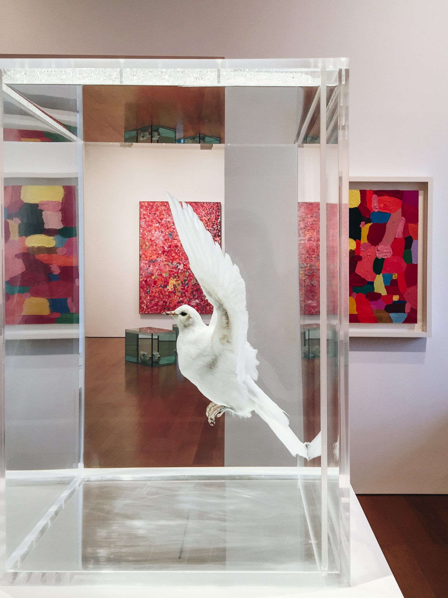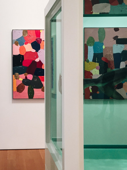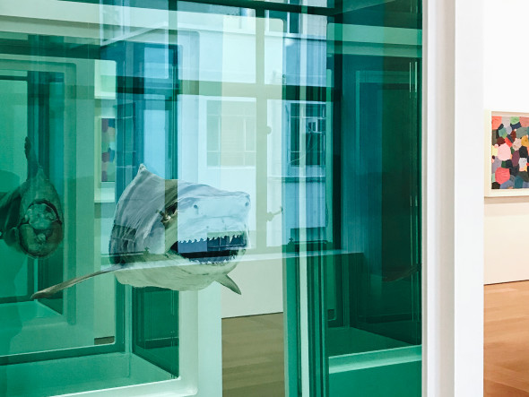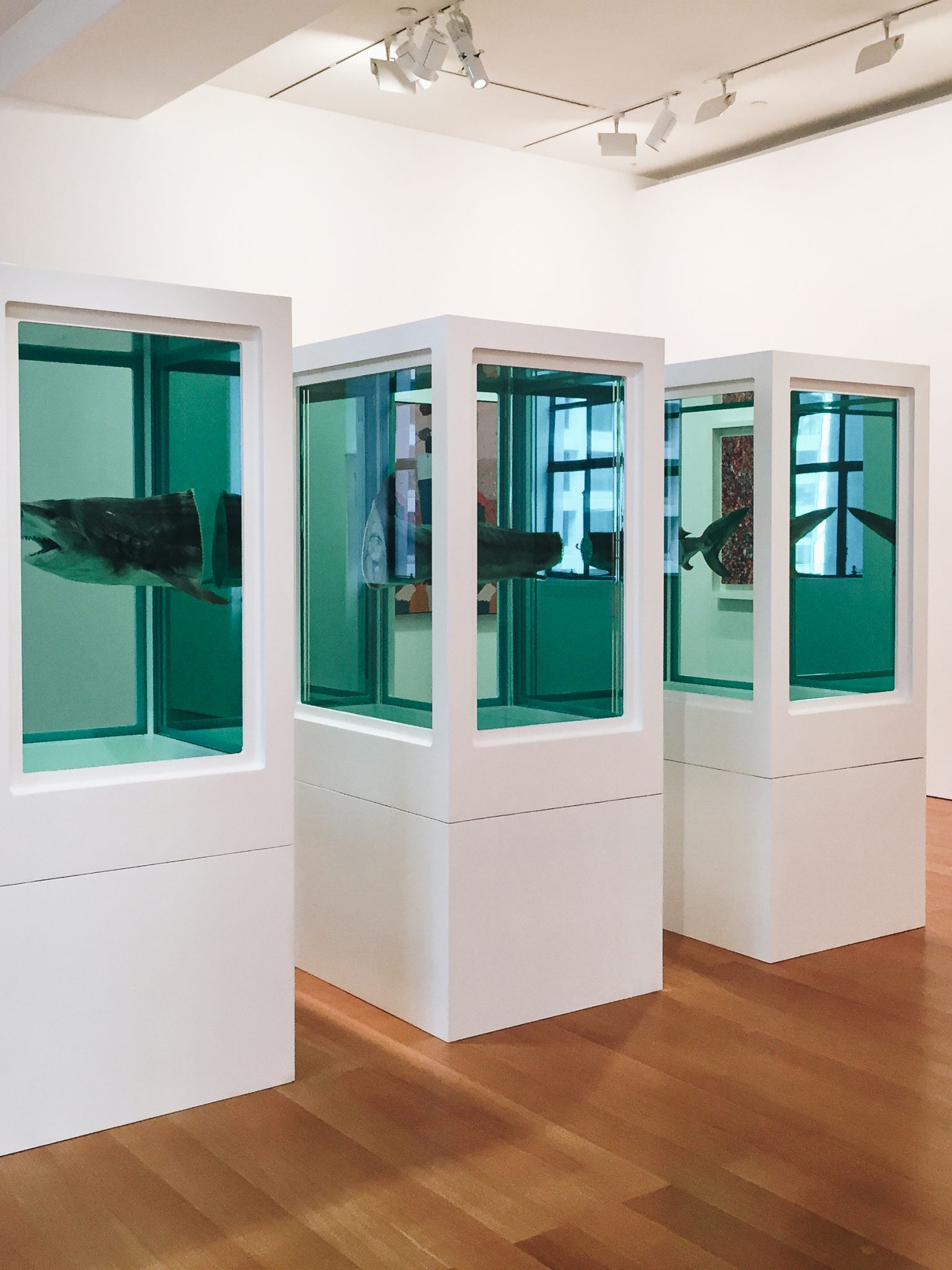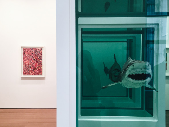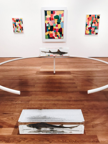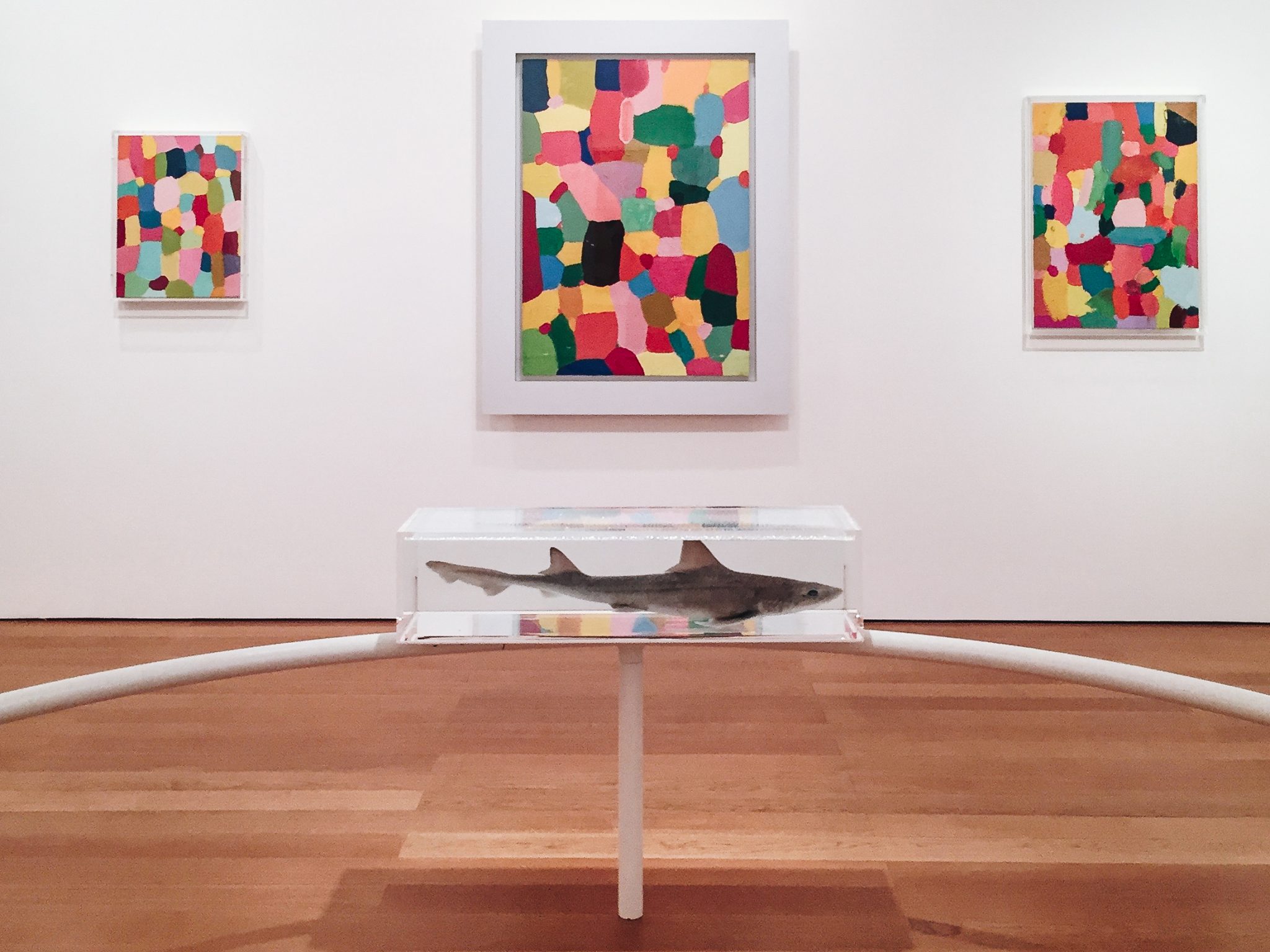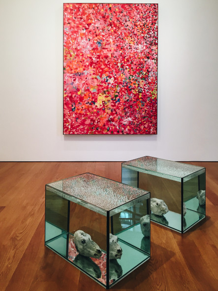 Il contrasto tra le colorate astrazioni dei dipinti “Visual Candy” e le viscerali sculture di “Natural History” è forte. I primi si ispirano all’impressionismo, al puntinismo, all’espressionismo astratto e alla pop art; le sculture -le famose vasche di vetro contenenti specie animali conservate nella formaldeide- sono pura ricerca scientifica, presentata con un design minimale.