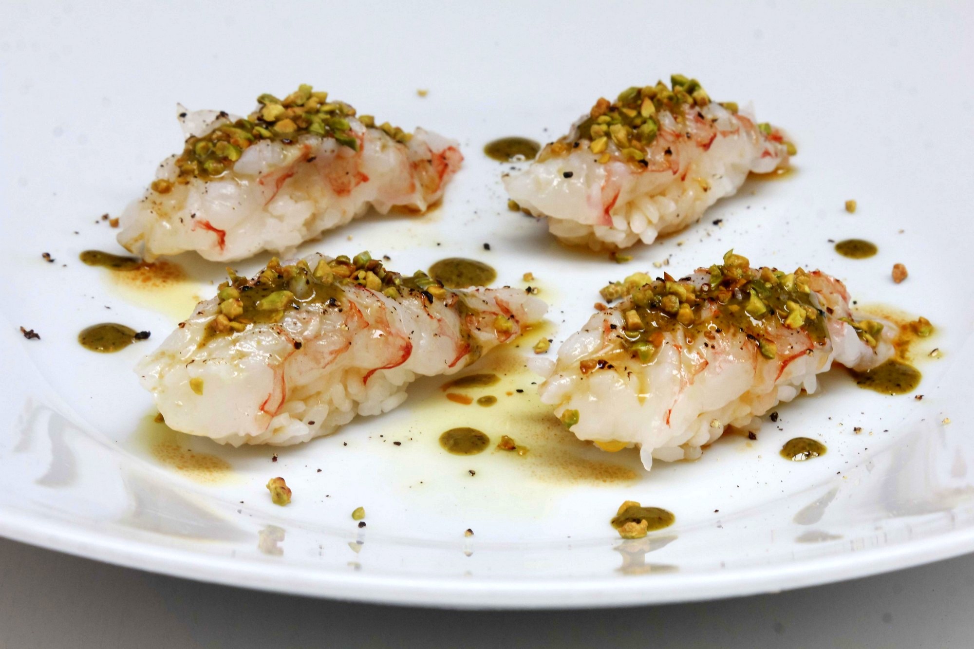 “Lo notai al supermercato e me lo portai a casa”, racconta Alex. “Il gusto mi piaceva ma lo sentivo un po’ troppo deciso, e così iniziai a cercare una via personale all’equilibrio, con l’aiuto dei profumi e dei sapori del mio paese. Nacquero da queste premesse le mie variazioni sul tema, ossia ricette che mettono insieme il pesce crudo tagliato secondo l’arte degli antichi maestri giapponesi, e ingredienti come capperi di Pantelleria, pistacchi di Bronte, tartufo bianco, erbe e spezie mediteranee. Fino ad arrivare a quella che sarebbe diventata un classico della mia cucina: la “emu”, un’ emulsione con un 65% di salsa di soia e un 35 % di olio extravergine di oliva, dato che la prima da sola mi sembrava un po’ aggressiva. Ci stava bene un po’ di dolcezza all’italiana”.