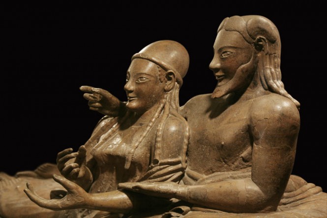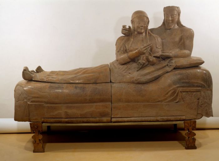 La storia che questo Sarcofago, che sarcofago non è ma trattasi di urna funeraria, racconta in primo luogo la storia di un viaggio destinato a portare queste due persone nel tempo infinito dell’eternità; tale viaggio iniziato attorno al VI secolo a.C. a nord di Roma, nella Necropoli di Cerveteri, fu bruscamente interrotto da quei tombaroli che per primi profanarono la tomba e distrussero in centinaia di pezzi tale sacro simbolo di unione eterna.
