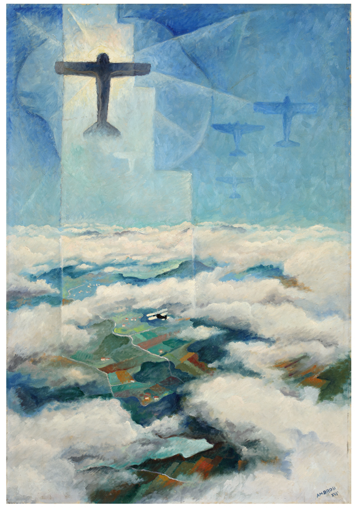 Come, ad esempio, Alfredo Gauro Ambrosi (Roma, 1901 – Verona, 1945) e Wladimiro Tulli (Macerata, 1922-2003), entrambi aeropittori: del primo, conosciuto soprattutto per l’ “Aeroritratto di Benito Mussolini aviatore”, viene proposto un olio su tela d’intonazione sensibilmente retorica che testimonia, trasfigurato in chiave eroica, il clima tragico di quei dannati anni di guerra; del secondo notiamo un “Aeroporto di cartone e nuvole” già incline all’astrazione, una linea di ricerca che verrà approfondita nel dopoguerra grazie anche alla frequentazione di Alberto Burri. Ci sorprendono alcune tempere pre-futuriste e un delicato disegno in stile divisionista di Boccioni.