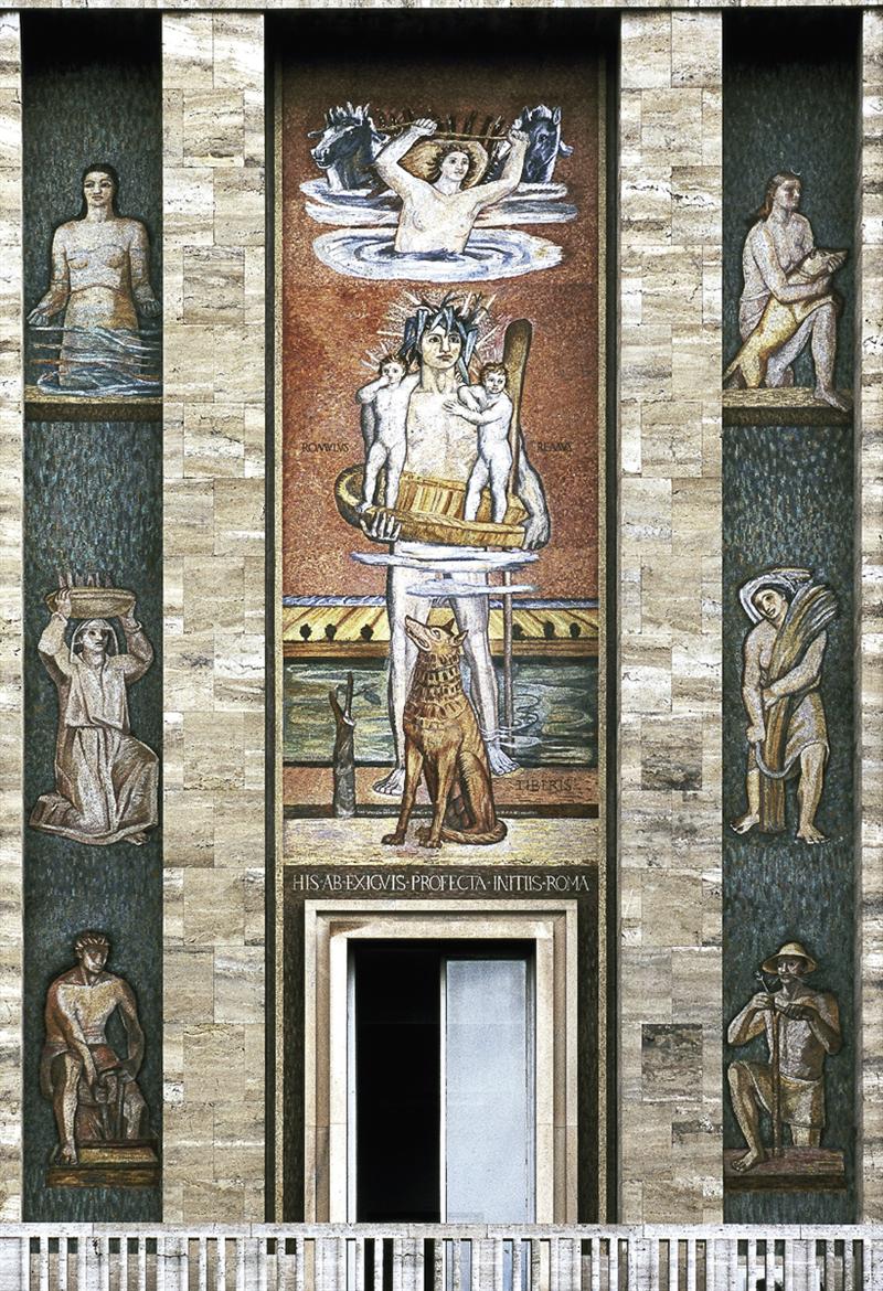 Nella nuova sistemazione dell’area, l’edificio romano conquista il centro di una piazza concepita come un moderno foro romano dotato di porticati che ospitano attività commerciali, uffici pubblici e sale di spettacolo. Coinvolto nella decorazione della facciata principale dell’edificio più importante della piazza, Ferrazzi propone la sua personale rivisitazione del mito delle origini di Roma, utilizzando, per abbattere i costi di produzione, la tecnica del mosaico in luogo della tarsia marmorea originariamente prevista.