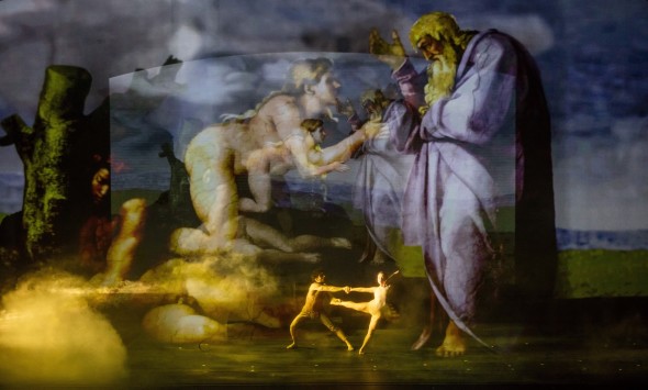 Il Giudizio Universale di Michelangelo è come un portale di conoscenza, di consapevolezza che pone un’occhio su quella che è l’umanità. La nostra è una tecnologia ‘organica’ , al servizio dell’umanità. Michelangelo al suo tempo usava tutte le tecnologie che aveva a disposizione come noi oggi usiamo il sound design , le video proiezioni ad altissimo livello e così via. Quella gerarchia che di solito c’è nel teatro classico in questo caso viene un po’ ribaltata, hanno tutti voce in capitolo e concorrono insieme a raccontare questa incredibile storia.