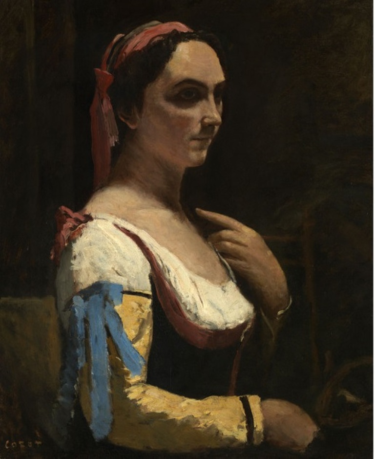 Fondamentali per lo sviluppo della sua carriera, furono però due viaggi compiuti in Italia, il primo fra il 1825 e il 1828, e l’altro nel 1834; ebbe modo di studiare la calda luce mediterranea, soprattutto fra Napoli e Roma, ma anche di conoscere le donne locali, con i loro variopinti costumi popolari; è qui che scopre il gusto per il pittoresco, per quei corpi dalla straordinaria freschezza narrativa, che in parte ritrasse sul posto, e in parte ne conservò il ricordo anche dopo essere rientrato a Parigi, dove si servì di numerose modelle, francesi ma anche italiane, per riprodurre in studio quanto aveva visto in Italia. Con le sue figure femminili, Corot affronta la questione dell’immaginazione, nella doppia accezione descrittiva e creativa; si tratta infatti di soggetti posti a metà fra il naturalismo e l’estro pittorico vicino al “bello naturale” di bartoliniana memoria, che aveva rivoluzionata la scultura ma aveva avuta una certa influenza anche in pittura. Nell’Italia ancora profondamente rurale dell’epoca, Corot resta affascinato dai colorati costumi popolari e dalla sospensione fra passato e presente che si respira, Oriente e Occidente, soprattutto nel Meridione. Sviluppa quindi un interesse per il ritratto popolare, e arricchì la sua tavolozza dei toni del verde, dell’ocra e del marrone. Emma Dobigny fu una delle sue modelle preferite, che si prestò per numerosi ritratti in costume dal sapore orientale, curiosamente caratterizzati da una tavolozza non particolarmente brillante, a differenza delle tele orientaliste di Gérôme e Delacroix.
