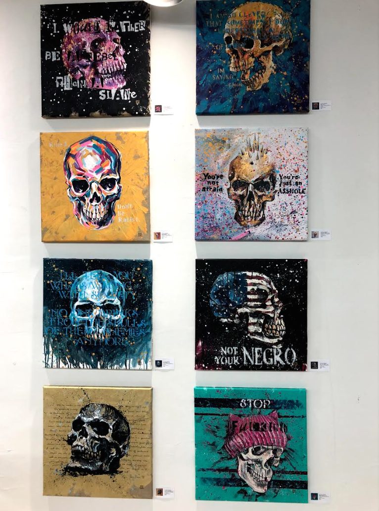 In Citizen Grey’s series Amplified Division via #FakeNews, the artist displays hypothetical tweets from historical leaders, having them comment on current events. While social media can have an inherently light tone, the piece has somber undertones. Grey creates a conversation connecting the past, present and future. Displayed behind plexiglass, the pseudo phone screen frames further highlight the deep-rooted connection between technology and our consumption of news and current events. The anonymity of the artist’s identity adds to the intrigue of the piece as the viewer can’t immediately assume anything about his/her views.