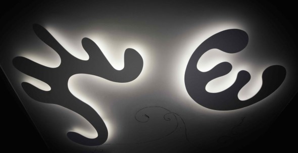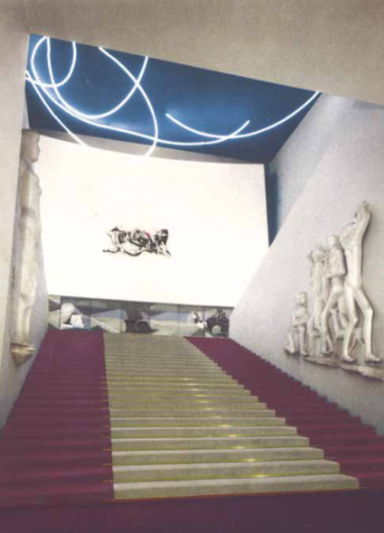 In contrasto con il rigore ortogonale dell’ambiente, le forme curvilinee di Concetto Spaziale rimandano ad Jean Arp o alle coeve gouaches découpées di Henri Matisse; l’utilizzo poi del neon come luce indiretta, è in stretta relazione con il celebre Concetto Spaziale al neon della Triennale.