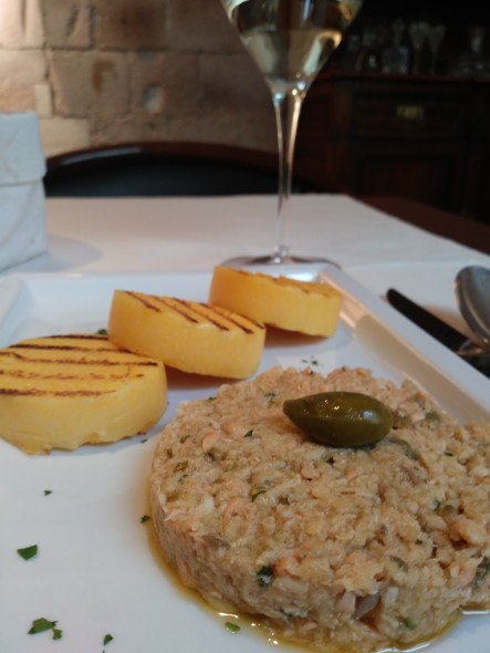 Imboccata la strada semi parallela a via Mazzini, che conduce dopo poche centinaia di metri a piazza Erbe, una salita permette di scappare dalla fiumana di turisti appena rifioriti, per scoprire dopo pochi passi una piazzetta con un’insegna chiara proprio sulla destra: Il Campidoglio. Per metà ristorante tipico veneto, per metà filetteria. La prima sala è semplice, ma curata. Il design è moderno, ma non eccessivo. Insomma, un luogo in perfetto equilibrio tra eleganza e accoglienza. Il menu non è molto articolato (ed è un bene, perché meno si fa, meglio lo si fa!). I filetti sono la specialità della casa, ma perché un ristorante funzioni, tutto dev’essere egualmente di qualità, così si parte con gli antipasti, prediligendo una tipica Trota salmonata servita con polentine.