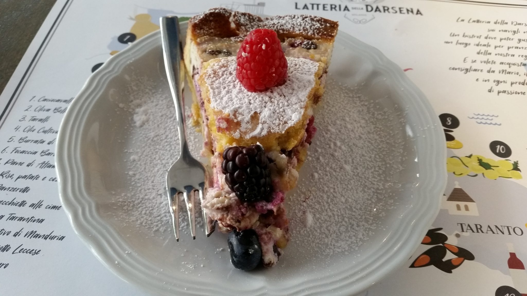 I latticini di antipasto sono un esempio spettacolare di cosa s’intenda per tipicità: ricotta freschissima e cremosa, nodini callosi al punto giusto (e non mosci e avvizziti, come troppo spesso capita), il caciocavallo “occhiuto”, con i simpatici buchini nella pasta color crema, davvero interessante. Nel polpo ridotto al Primitivo e alga Nori, il sapore del mare e quello del vino rosso possono andare d’accordo, a patto di non esagerare col secondo. L’asino cotto lentamente, con erbe aromatiche, ha una carne magra e asciutta, che rilascia nel suo intingolo al pomodoro un non so che di inconfondibile, qualcosa che nel raggio di dieci chilometri dalla Latteria della Darsena non si troverà a nessun prezzo. E per finire i dolci: nella loro semplicità, il pasticciotto con crema e amarena e la torta di ricotta con gocce di cioccolato e lamponi erano in grado di accontentare anche gli epicurei, che non sono i seguaci di Epicuro ma coloro per cui a tavola non è vera festa, se manca il dessert.