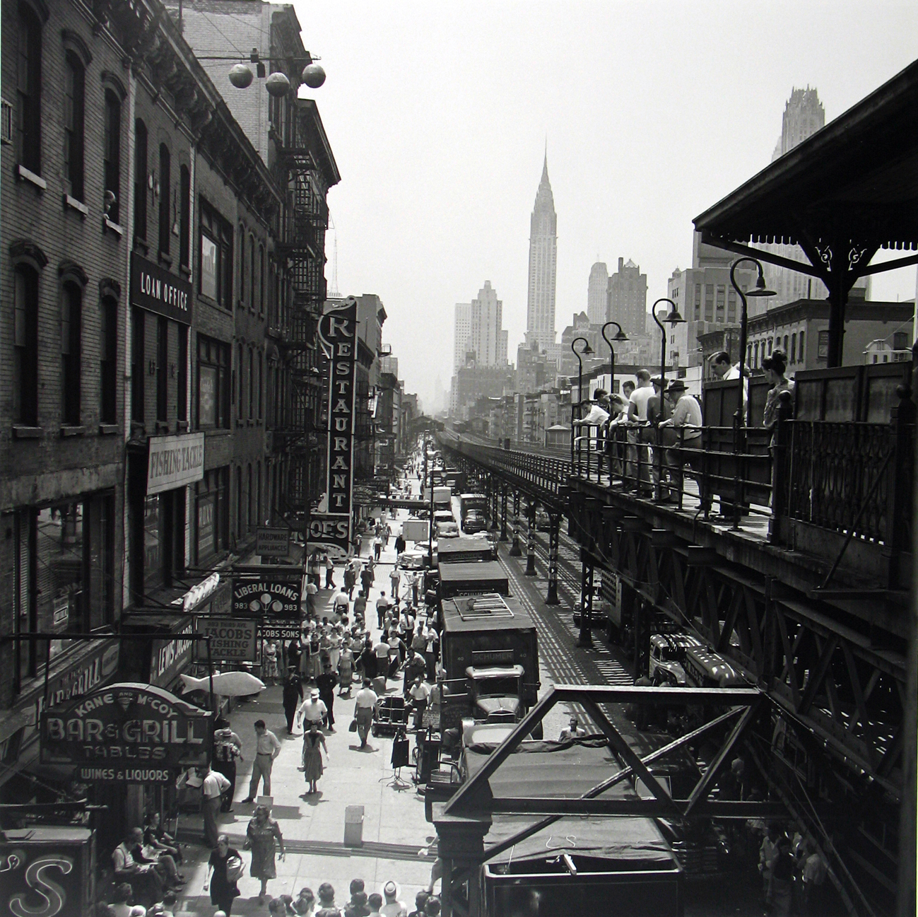 Vengono chiamate “fotografie di strada”, afferrano la quotidianità reale, non sono panoramiche, hanno poca profondità, ma catturano con forza un istante della vita metropolitana capace di darci un ritratto pungente e sfaccettato di un’epoca e di un’umanità. I personaggi, perché ogni foto suggerisce una storia da cui si potrebbe trarre un film (americano ovviamente), sono per lo più colti di spalle o di profilo e spesso dal basso, come se fossero state scattate all’insaputa del soggetto, del quale riescono a cogliere una naturalezza ben lontana dalla posa consapevole.