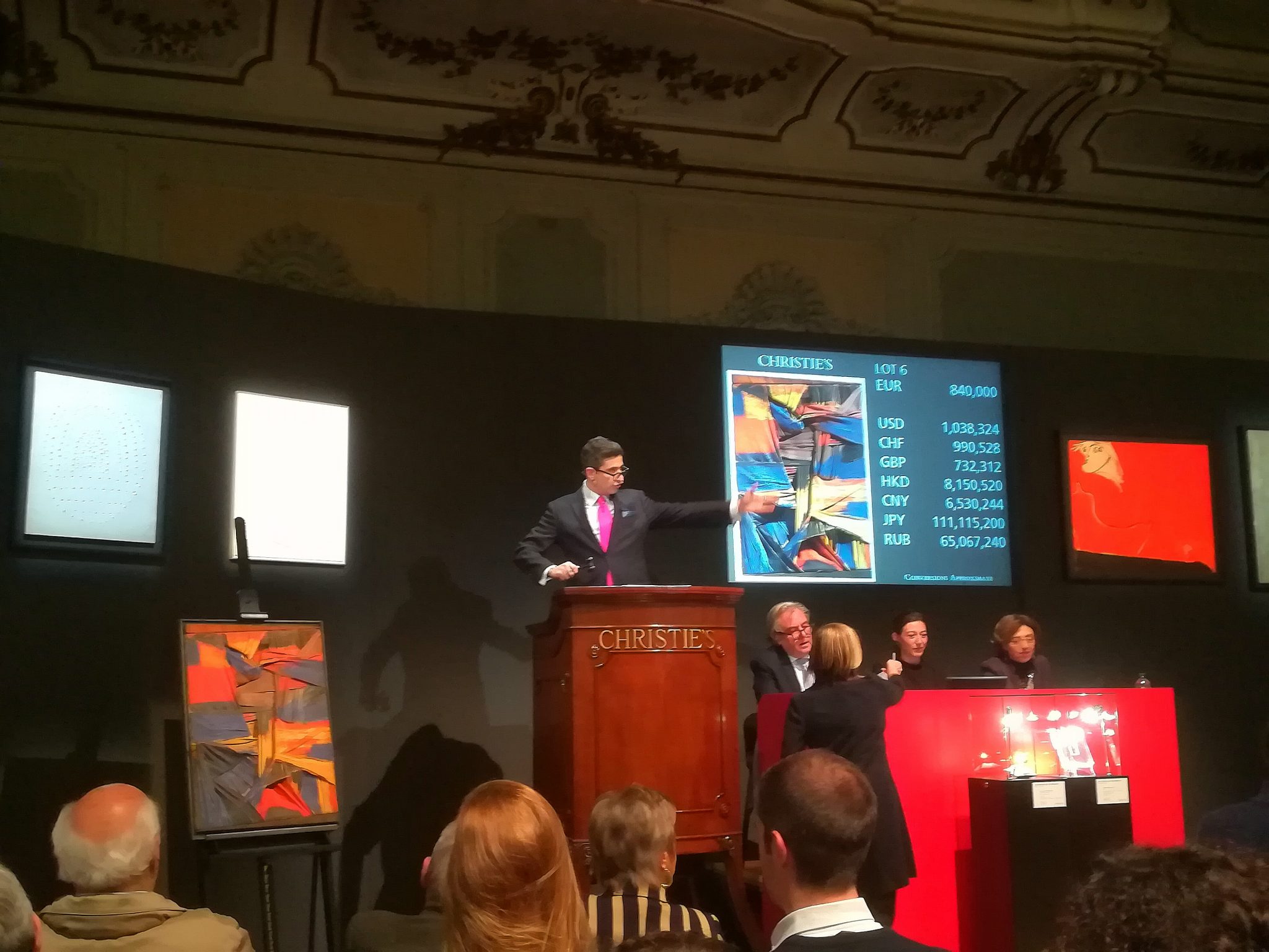 Il top price (annunciato) della serata è stato per Piero Manzoni. Il suo Achrome è stato venduto a un bidder al telefono per 2,967,500 euro. Appartiene alle prime serie Achrome e non era mai passato in asta prima. E’ stato esposto anche nella retrospettiva milanese dedicata all’artista nel 2014 a Palazzo Reale. Secondo classificato Lucio Fontana con un classico taglio rosso aggiudicato a 1,687,500 (stima 700,000 – 1,000,000).Infine terzo posto per l’Ammiraglio di Salvatore Scarpitta: 1,060,400 euro per questa tela realizzata nel 1958, uno degli anni più importanti nella carriera dell’artista, proprio quando inzia a lavorare alle cosiddette tele ‘bendate’. Il lavoro in asta stasera era particolarmente raro perchè dipinto con i toni del blu, del rosso e del nero. Era stato esposto nell’aprile del 1958 alla Galleria La Tartaruga di Roma.
