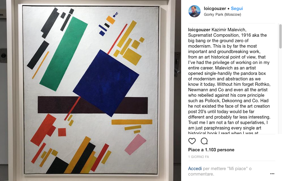 L’esperto della maison di Pinault scrive «Suprematist Composition, 1916 aka the big bang or the ground zero of modernism» per sottolineare l’importanza dell’opera. Prosegue Gouzer, con commento più personale: «Questo è di gran lunga il lavoro più importante e innovativo, dal punto di vista storico artistico, con cui ho avuto il privilegio di venire a contatto durante la mia intera carriera». Malevich è stato l’artista che ha aperto da solo il vaso di Pandora del modernismo e dell’astrazione come la conosciamo oggi. Senza di lui possiamo dimenticarci di Rothko, Newmann & Co.