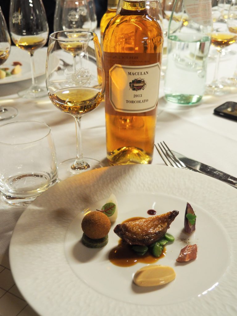 Si sono sfidati Filippo Battistello, chef del ristorante Al Pozzo di Mason Vicentino con il piatto Insalata di mare abbinato al Malvasia delle Lipari Cantine Golosi; Paolo Longoni, chef del ristorante Bellavista di Veleso (Como) con il piatto Cannelloni di foie gras, riduzione di balsamico e frutto della passione, giochi di spezie, purea di mela e zenzero abbinato ad Acini Nobili 2011 Maculan; Adriano Fedi, cuoco amatoriale di Savona e titolare del blog Insalata di Vetriolo che ha proposto il Raviolo Cremoso di Gorgonzola, Brodo di Aringa Affumicata e Maionese di Pomodoro abbinato a Torcolato 2013 Maculan, oltre a Mauro Buffo e il suo piccione, che si è aggiudicato il Premio Maculan, un’opera figurativa realizzata dall’artista vicentino Pino Guzzonato.