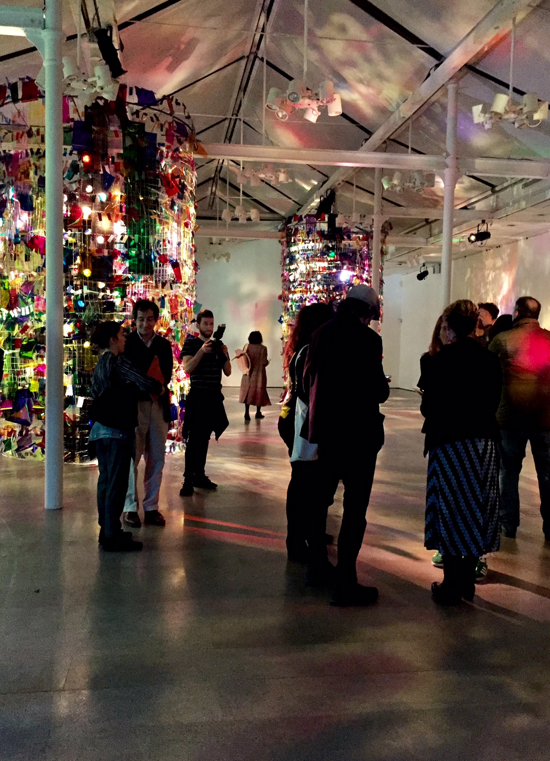“Blowing in the wind” è l’installazione site-specific che dal cortile d’ ingresso esterno accompagna fino agli spazi interni, dove sono sospesi tre macro-elementi cilindrici, voliere rivestite da piccoli moduli policromi di gelatina plastica, azionati da ventilatori e proiettori elettrici, che ne movimentano le strutture, generando e diffondendo riflessi sulle pareti, giochi di luce variopinta e di ombre, ma anche sonorità low-tech, come il suono analogico delle diapositive che scattano.