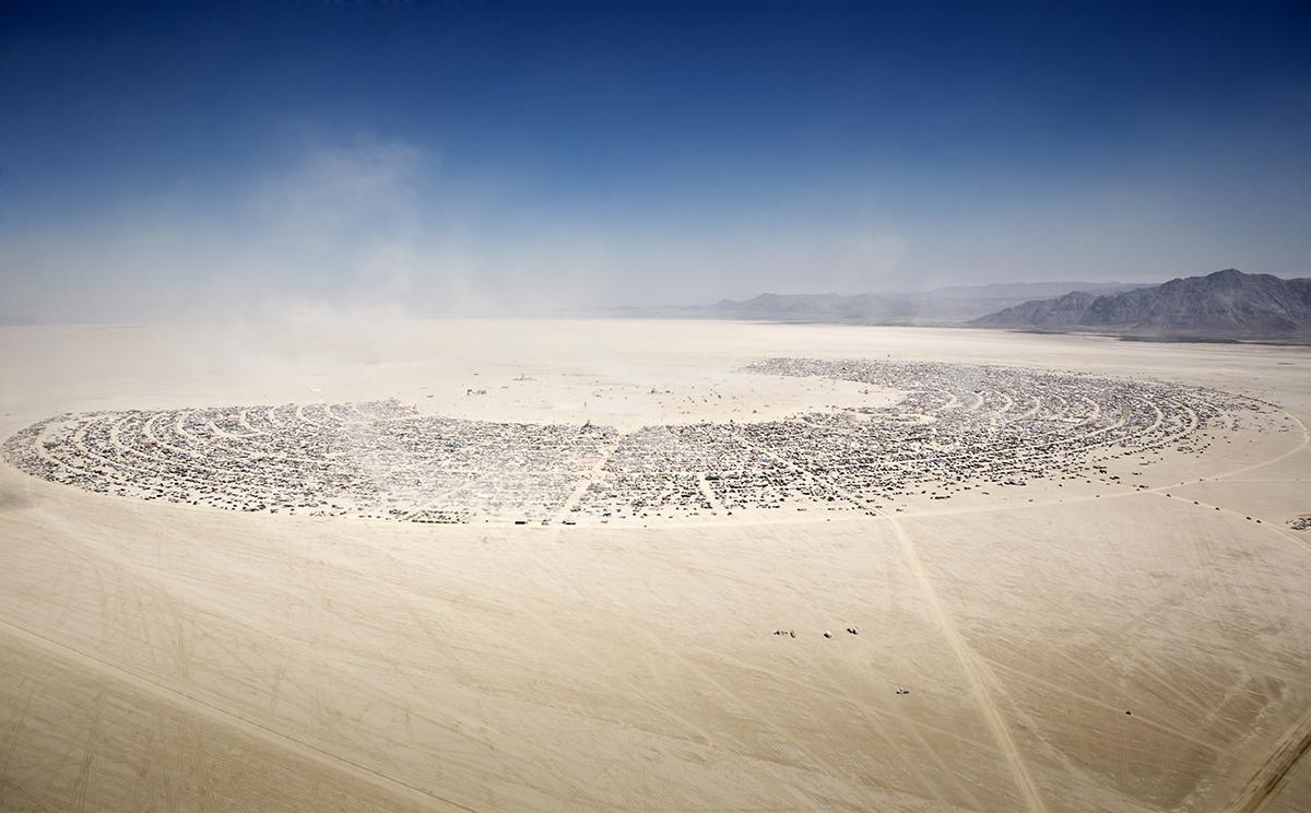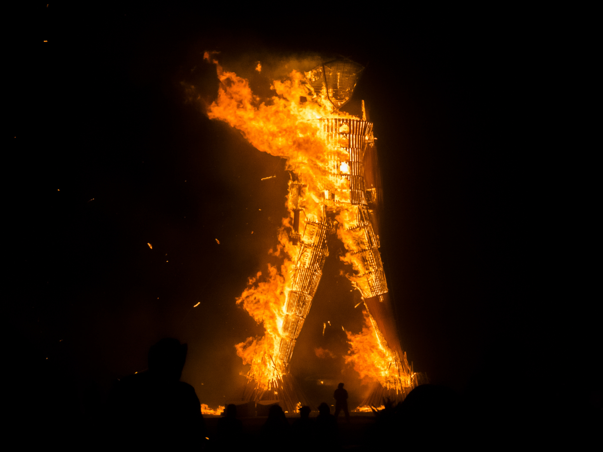 Nello scenario del semicerchio sono rappresentate innumerevoli performance artistiche, opere stravaganti come un enorme robot costruito con auto giocattolo, una macchina pupazzo che viaggia sulla sabbia, alberi in sfilata, burner vestiti come animali pelosi che danzano su una sorta di molo. Dal nome del festival, si svolgono continui roghi di installazioni d’arte e il rito che dura da 31 anni prevede nella giornata di chiusura quello di una figura gigantesca costruita in legno come Pinocchio che arde nelle fiamme fra il tripudio della gente. Poi tutto svanisce fino al prossimo anno. Anche la città che li ospita, Black Rock, vive solo questi nove giorni sulla Sabkaha, la disetsa salata del destro, a 90 miglia Nord Est di Reno.