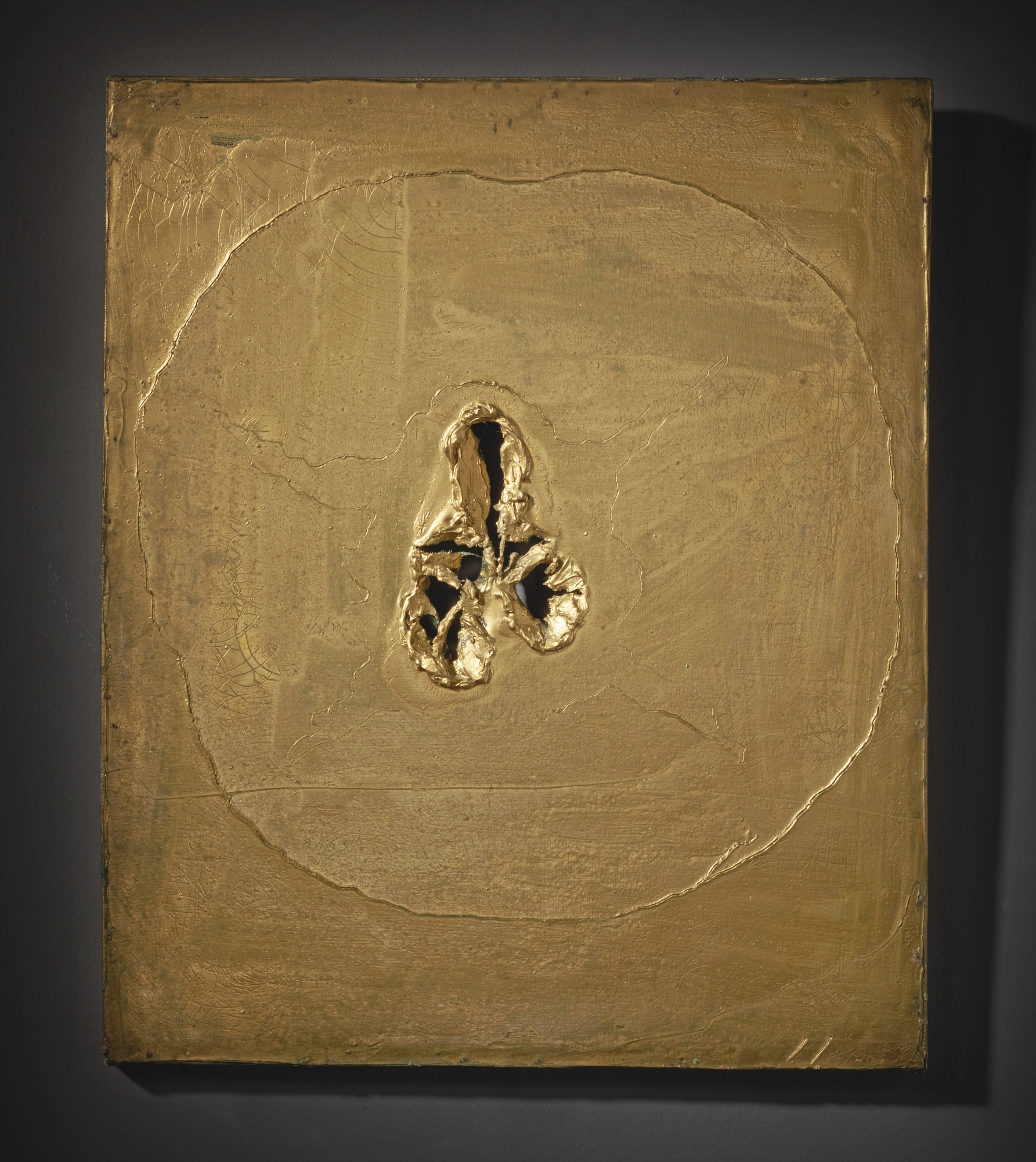 SIGNED, OIL, HOLES AND GRAFFITI ON CANVAS, GOLD. EXECUTED IN 1963-64. THIS WORK IS REGISTERED IN THE FONDAZIONE LUCIO FONTANA, MILAN, UNDER N. 2313/1.