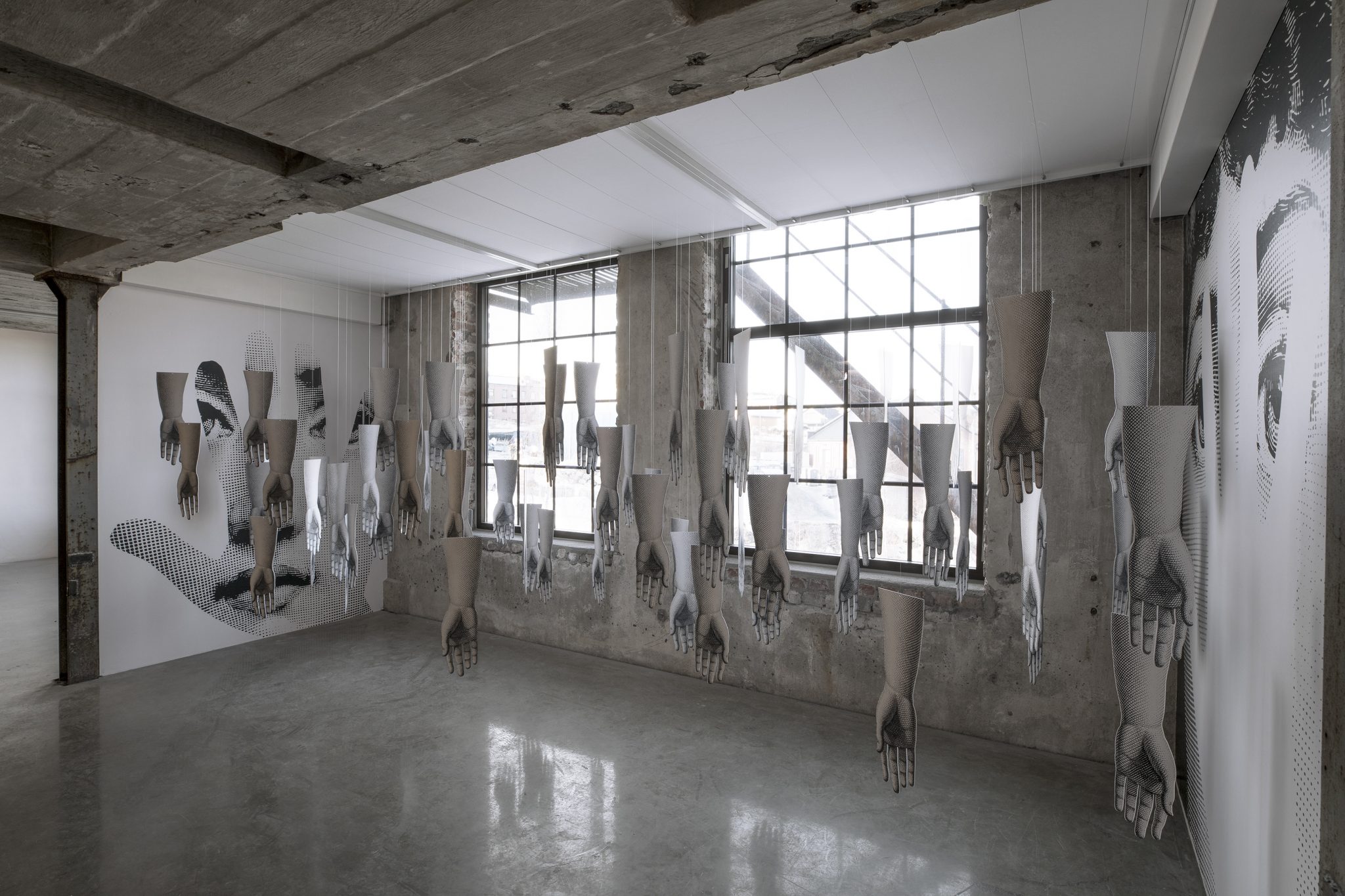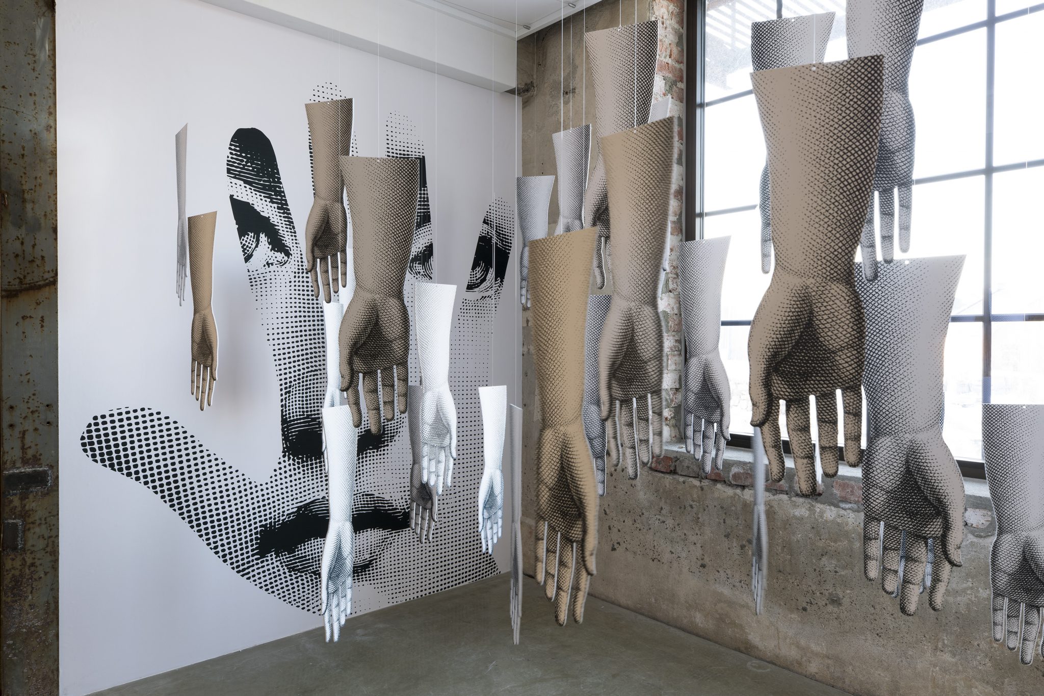 Qui il volto di Lina Cavalieri, attrice e cantate lirica vissuta a cavallo del XIX e XX secolo, è accompagnato da una molteplicità di mani, ad indicare i vertici di un’anatomia scomposta e riarticolabile a piacimento. Mentre un palmo può nascondere il volto, l’altro può sicuramente contenerlo, e tentare assieme di avvolgere lo spettatore in un molteplice, maestoso abbraccio. Ma coloro che si affretteranno ad attraversare l’installazione non verranno accarezzati dalle mani, bensì saranno schiaffeggiati e ammoniti dal vigile sguardo di Lina.