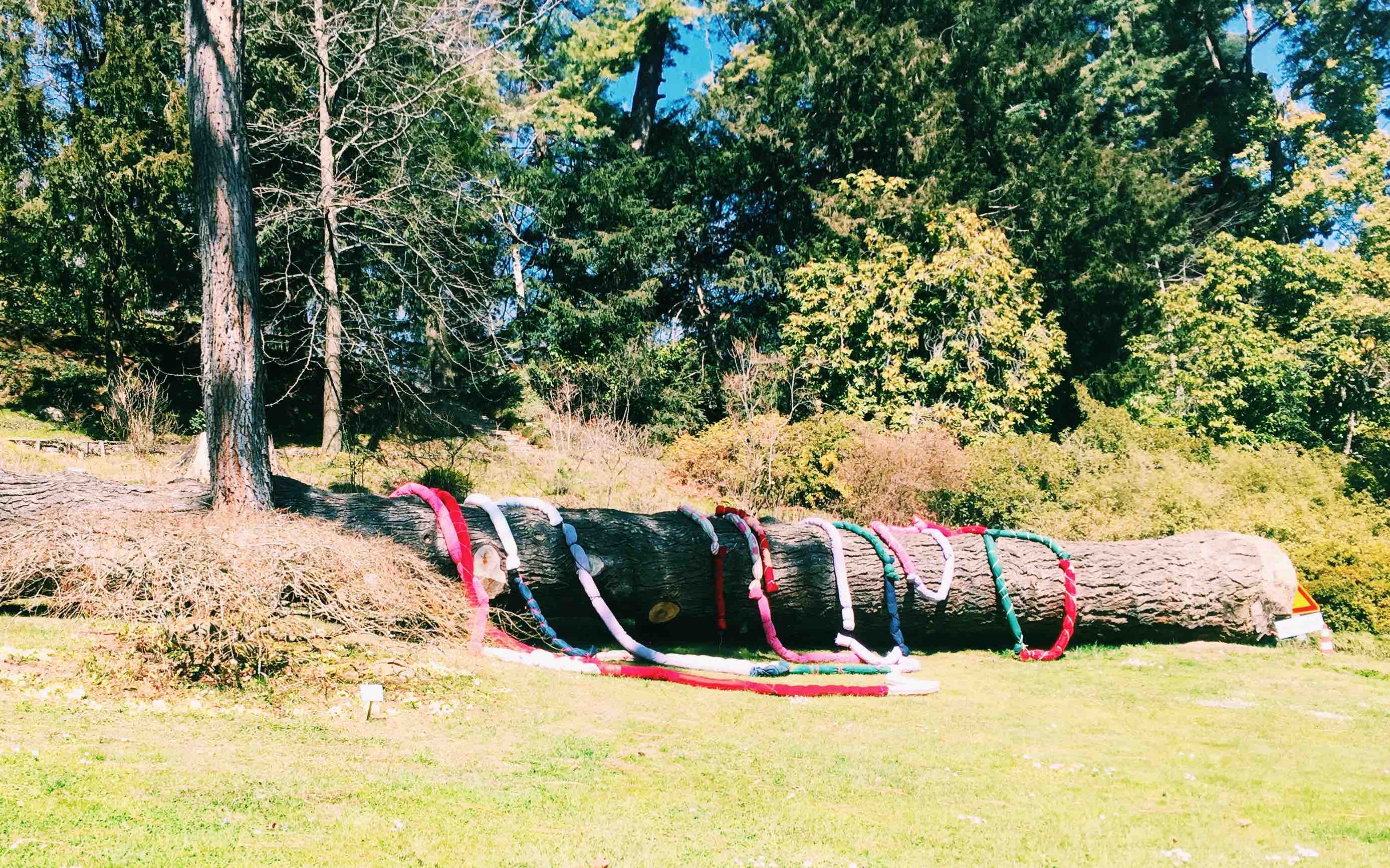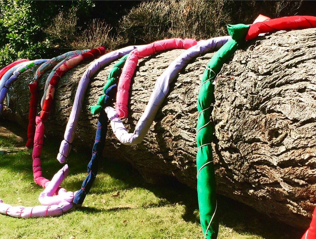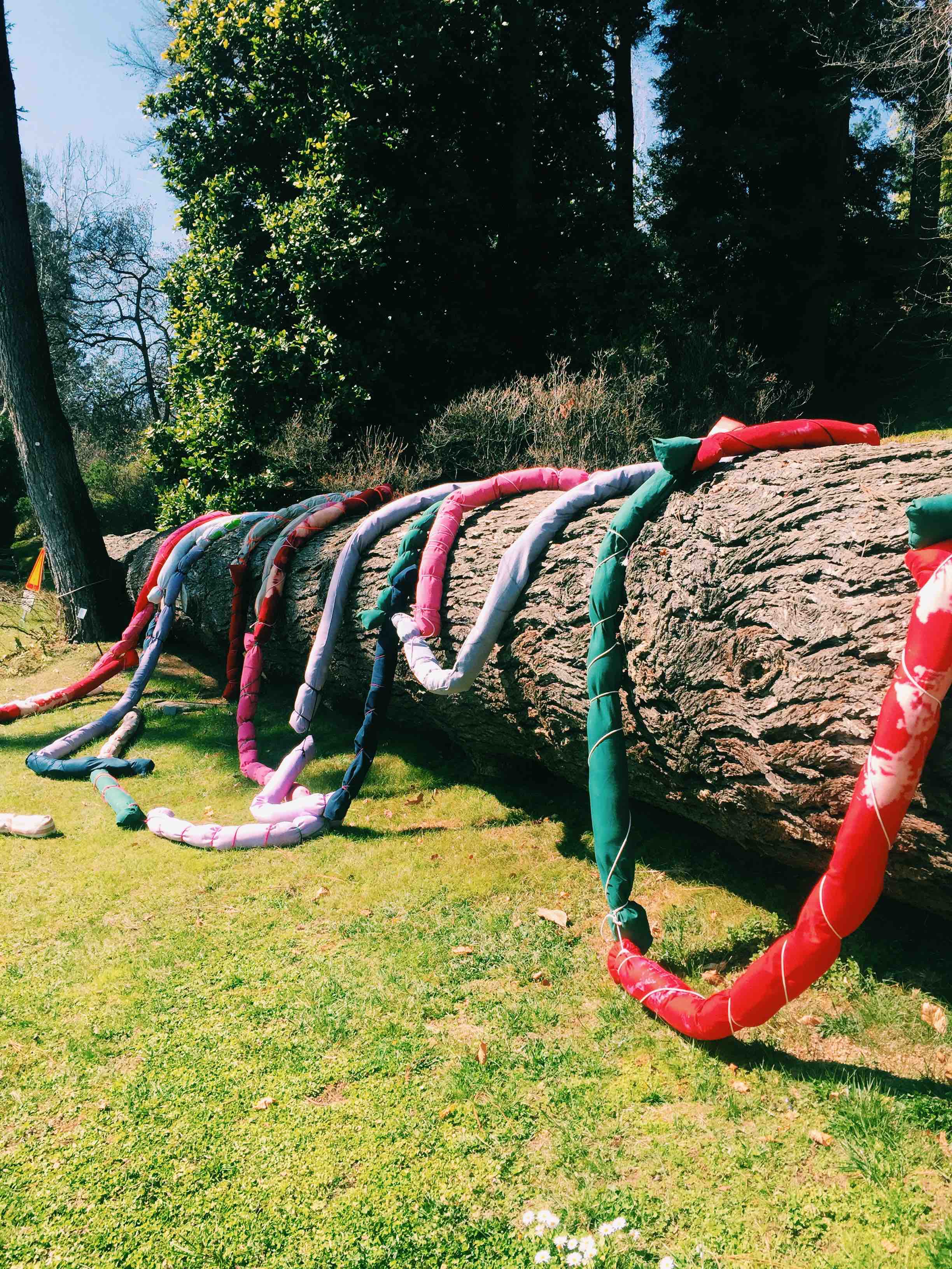 Durante il percorso finale di visita al giardino botanico le cinque installazioni esterne si presentano al visitatore, come affermato dallo stesso Frangi, come fossero reperti archeologici delle sue mostre. Una sola, Liane, non si mostra come tale perché concepita site specific dall’artista immediatamente dopo il primo sopralluogo, avendo notato con stupore il “cadavere” di una douglasia (abete americano) secolare sdraiata sul prato. Per questo motivo ha voluto renderle omaggio avvolgendola con spirali di tela colorati, dandole così una nuova vita.