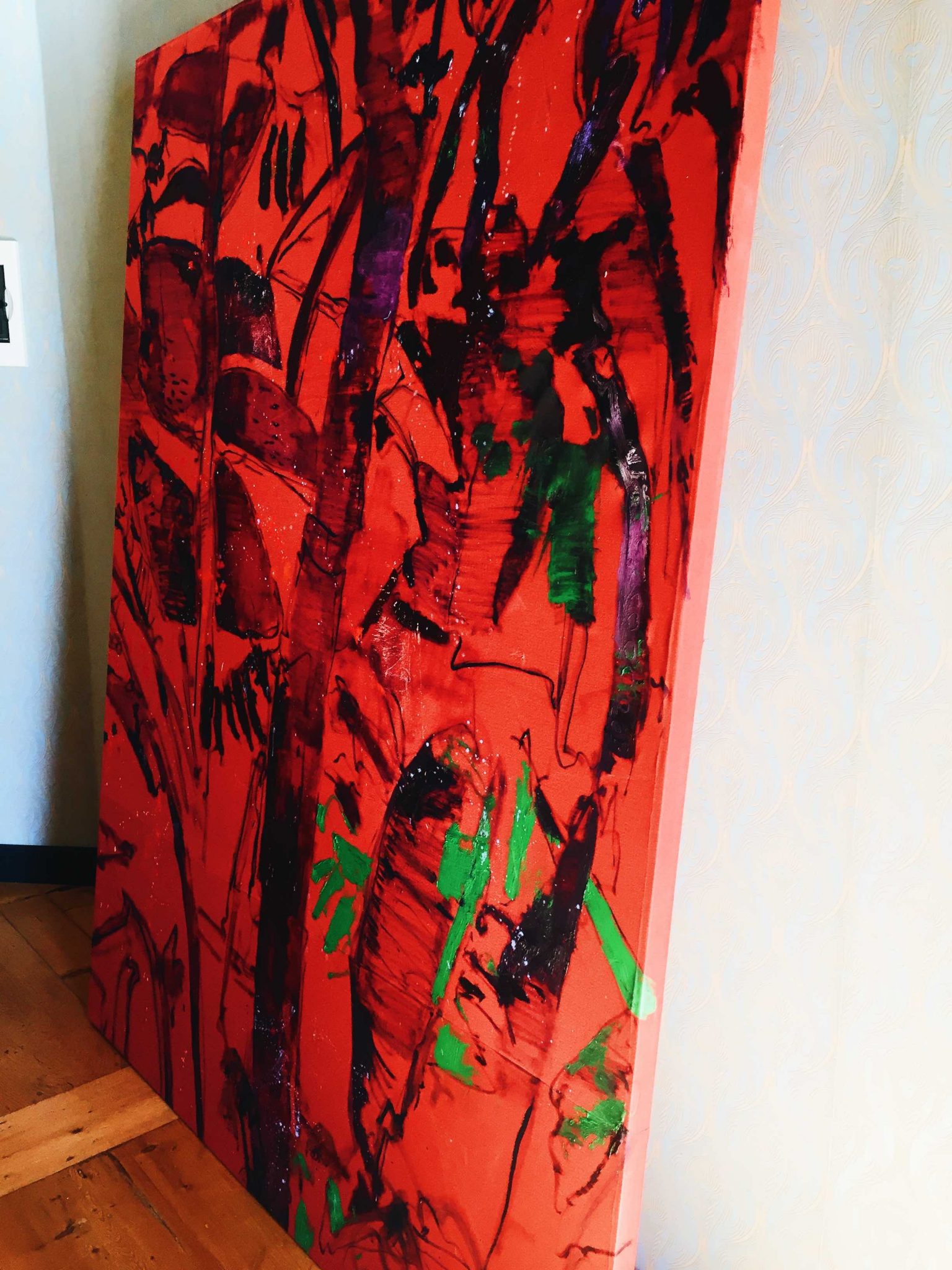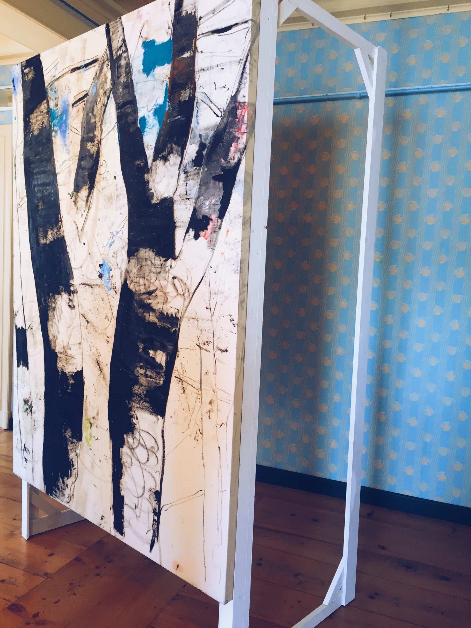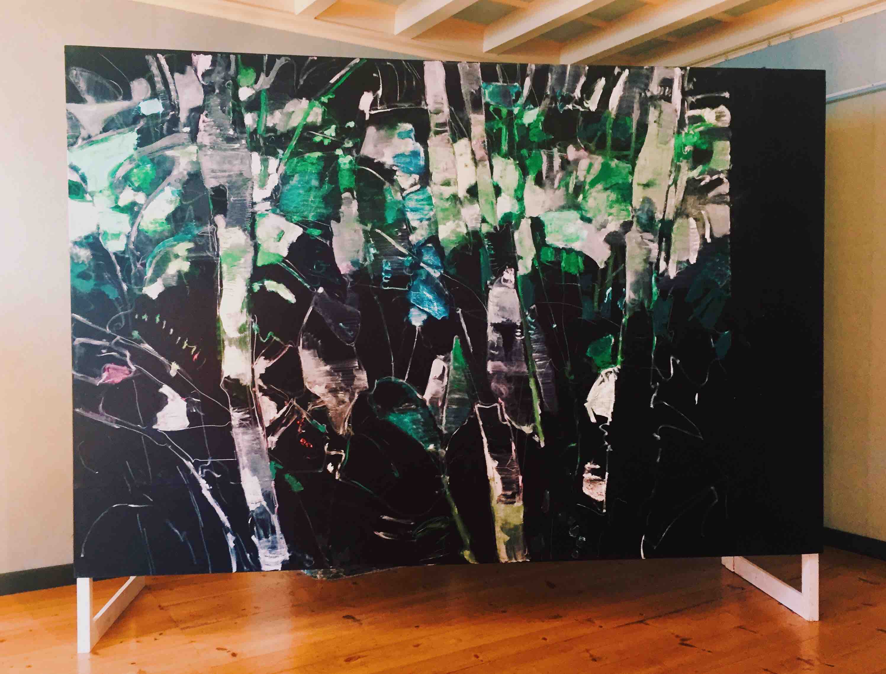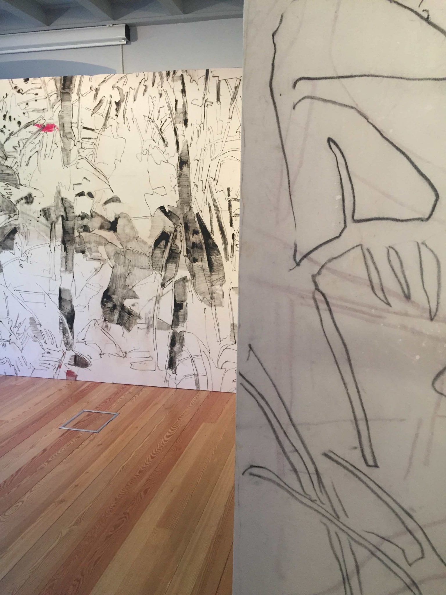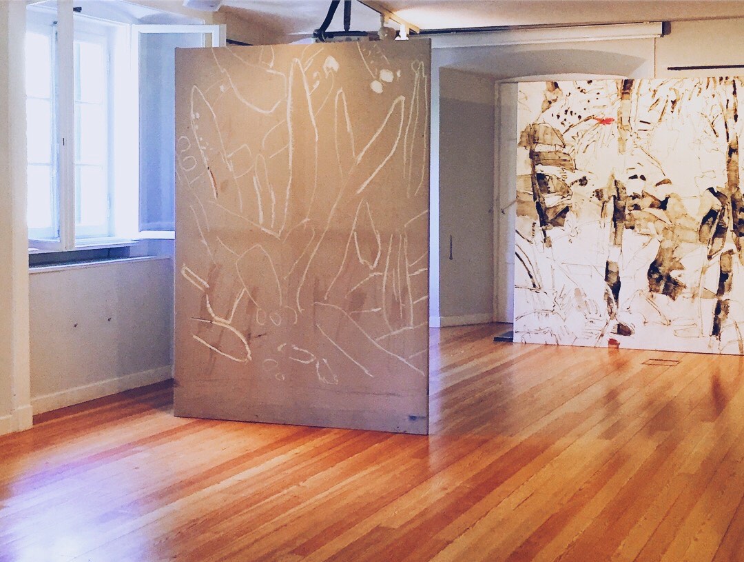 Nelle sale espositive del primo piano, dedicate ad un’antologia del lavoro precedente dell’artista, sono presentati i dipinti su tela dedicati al mondo vegetale, iniziando da Selvatico nella prima, dove da subito il rapporto con il mondo esterno è evidente grazie alle finestre spalancate dalle quali la luce e una leggera brezza entrano direttamente in contatto con le opere. Si prosegue, poi, passando per Ansedonia, teloni dipinti nei quali viene toccato il tema del rapporto con il bosco, ricorrente nell’opera di Frangi, che in questo contesto crea un rimando al bosco dei rododendri arborei presente nel parco della villa. Non possono poi mancare, i grandi dipinti delle Ninfee, il ciclo Alles ist Blatt e infine Pasadena.