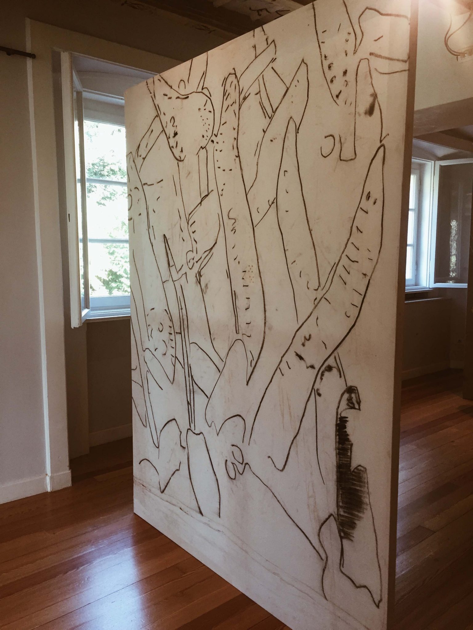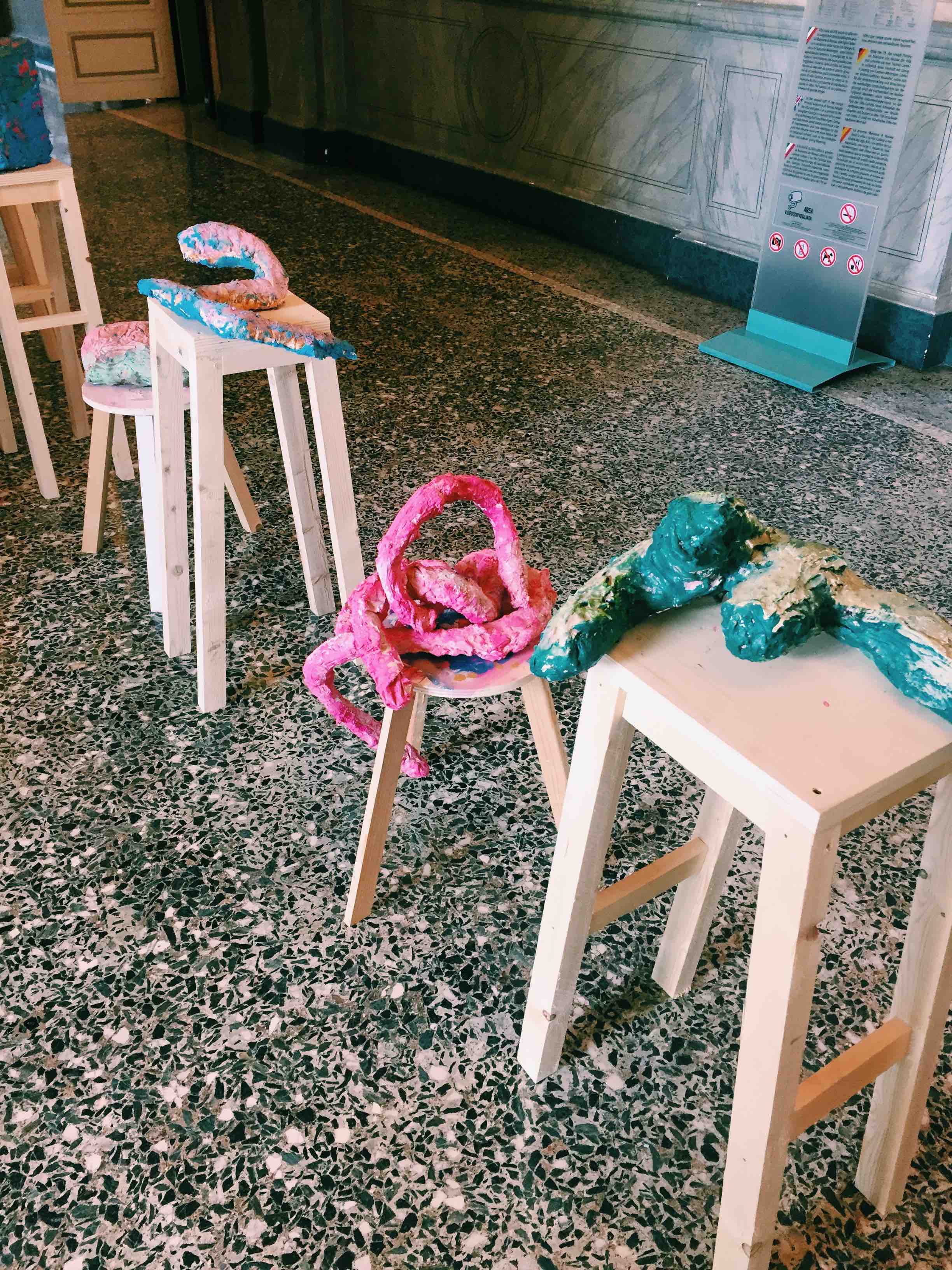 Al secondo piano una macchina, “sorella maggiore e un po’ eccentrica del cannocchiale a monetine” permette al visitatore di guardare il paesaggio lacustre attraverso l’occhio analitico dell’artista. Una seconda installazione, questa volta del tutto inedita, ci presenta la vita segreta delle piante tramite una serie di piccole sculture astratte in resina e gesso dipinte e posizionate su sgabelli, come se ci trovassimo di fronte a un’esposizione di fossili riesumati dagli abissi.
