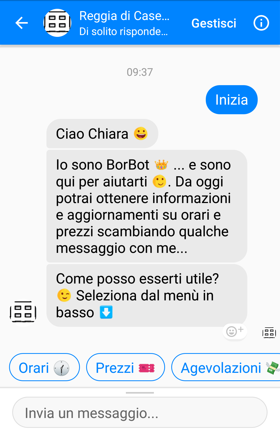 “Ciao, benvenuto nel mondo dei chatbot per musei! Ti posso aiutare?”.