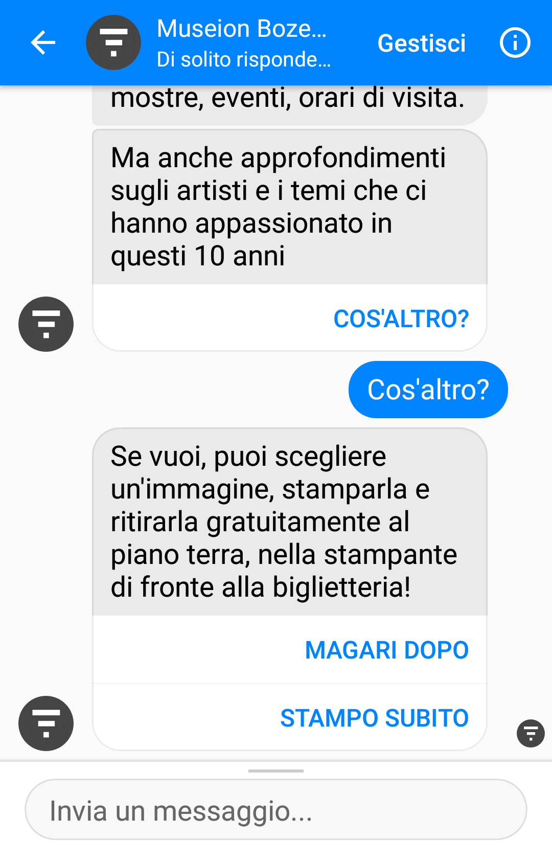 I chatbot possono avere molte applicazioni, anche creative, nel mondo dei musei. L’importante è tenere a mente che questi mezzi non sono altro che tasselli di una strategia comunicativa più ampia che deve porre al centro il visitatore. Quando vedo su Facebook Messanger i punti di sospensione che stanno per “il museo tal dei tali sta scrivendo”, un brivido di emozione lo provo, anche se è solo un software. Il museo sta scrivendo a me, parla proprio con me.
