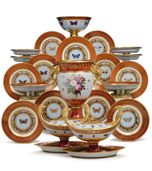 Concludiamo con le arti decorative, i cui lotti verranno offerti in due sessioni fra il 9 (253 lotti) e 10 maggio (282). Si segnalano fra gli highlight il servizio da dessert di porcellana di Sèvres, ‘Marly Rouge’, che fu realizzato per l’imperatore Napoleone attorno al 1807/1809 circa e stimato $150.000/250.000. Descritto dai report della manifattura come à fond rouge, papillons et fliers (con fondo rosso, farfalle e fiori), pare fosse stato ordinato originariamente da Napoleone per il suo palazzo di Compiange, ma che venne poi da lui utilizzato a Fontainbleu, nel periodo di circa un mese. Fu parte anche degli affetti che Napoleone si portò con sé nel suo esilio all’Isola D’Elba.