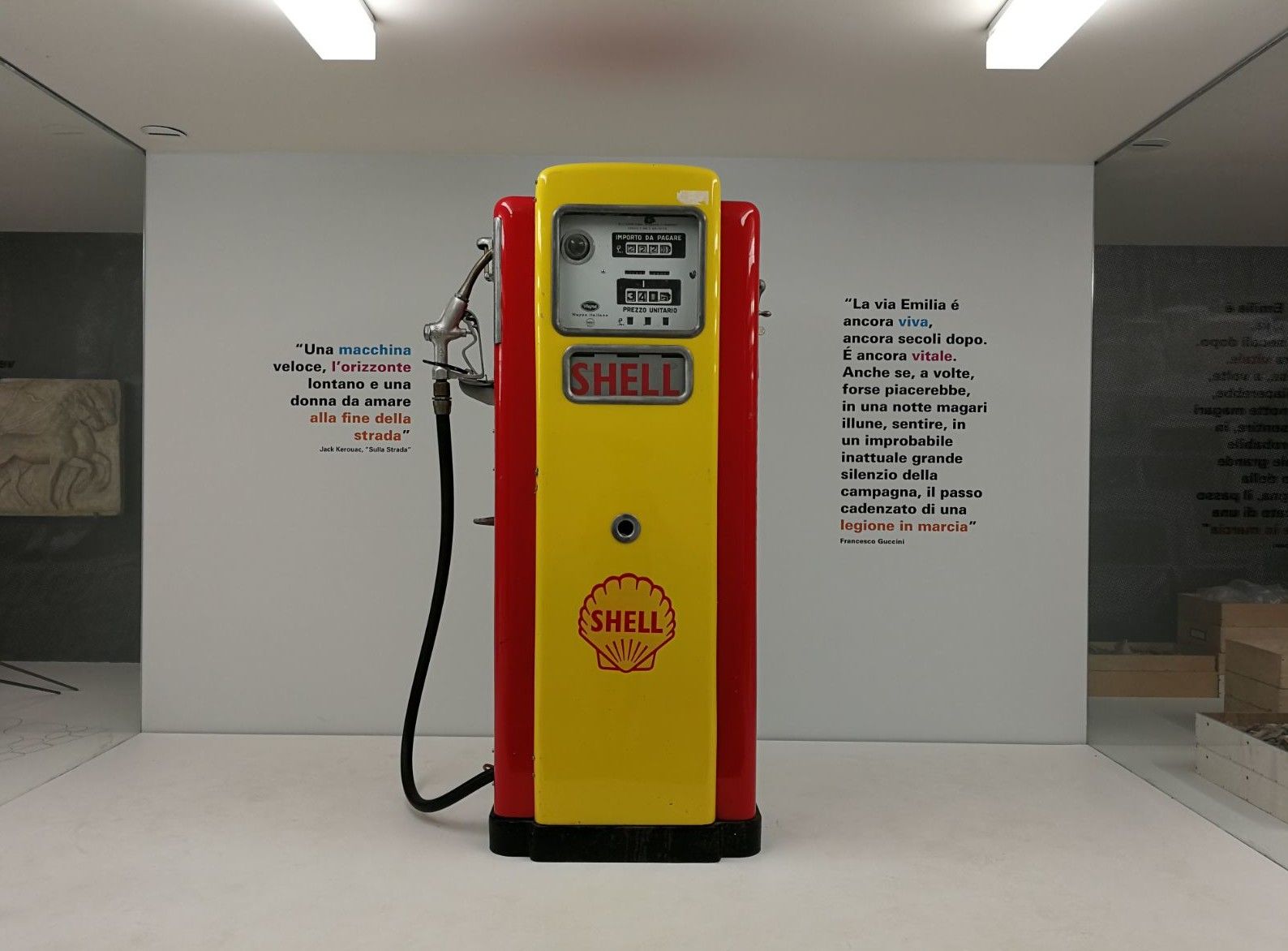 Si parte dunque dall’inizio, da prima dell’inizio. Si parte da quando ancora la via Emilia non esisteva e in età pre-romana le popolazioni lasciavano i primi segni di una scrittura rudimentale e le montagne appenniniche appena emerse restituivano scheletri di balena. È la civiltà etrusca a fungere da anticamera, da casello autostradale in ceramica e pietra per l’età romanica che vede la costruzione e il successo della via. Immergendosi in Via Emilia/SS9 troviamo un grande ambiente Sotto/Sopra, un percorso a specchio lungo 50 metri che restituisce in basso un’immagine antica della strada e il suo riflesso contemporaneo nelle proiezioni sul soffitto. Scegliendo liberamente se dirigerci a est verso Rimini (dove una foto di Ghirri fa da sfondo marino ai resti di un capodoglio imbalsamato spiaggiatosi secoli fa sulle coste della riviera) o a Ovest verso Piacenza (sede dei rilievi di un fregio d’armi che coronava un monumento funerario) troviamo lungo il sentiero sette punti di ristoro dedicati a temi trasversali la cultura romana e non. Limite, Ponte, Sepolture, Commercio, Foro, Locanda e Casa sono i temi raccontati negli “espositori-teatrini” fabbricati da un falegname emiliano per raccogliere reperti archeologi e supporti multimediali, uniti per raccontare schegge di vita quotidiana della via Emilia che è stata. Ad accompagnarci, sul soffitto, un’istallazione multimediale con riprese effettuate a livello zero della Via Emilia di oggi mira invece a restituirci visivamente l’attualità della strada.