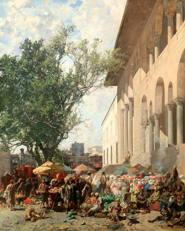 L’assolata vivacità delle antiche cittadine arabe, con il loro mondo di mercati, moschee, giardini lussureggianti, affascinarono il pittore emiliano, che seppe renderli con vivace cromatismo e attenzione al bello stile, mutuati dalla Scuola di Barbizon conosciuta poco prima a Parigi; nelle sue tele, Pasini traspone una calda luminosità che sembra lasciare sulla pelle l’effetto del sole onnipresente in quell’immenso Impero Ottomano, che dalla Turchia si estendeva fino in alla Palestina e alla Siria.