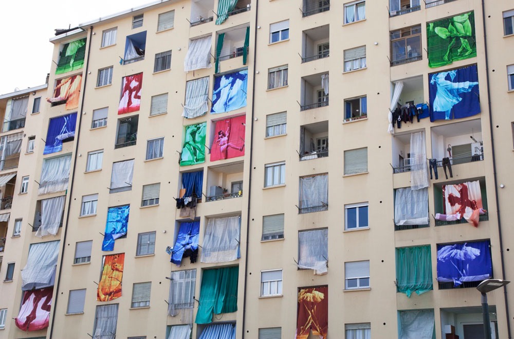 Lo stesso condominio, nel 2016, ha avuto un’importante collaborazione con la Galleria Franco Noero ospitando l’installazione dell’artista Arturo Herrera, segnando un punto chiave nell’idea di fare del palazzo uno specchio del quartiere che si trasforma. L’artista, rimasto affascinato dalla facciata e dai tendoni del palazzo, aveva chiesto agli abitanti la possibilità di sostituire alcune tende con la sua opera, che è stata donata agli inquilini. Il risultato è stato una bellissima scena di danza che ha creato un gioco di cromie che ha movimentato l’edificio con designi di danzatori a corpo intero e dettagli di ballerini. L’intervento di Herrera si trova esattamente di fronte alla Galleria Noero, dove da maggio a ottobre 2016 ha tenuto una personale con il titolo “Soave sia il vento”.